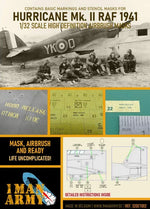 - Hoja de máscara con 25 símbolos y marcas que llevaba el Hawker Hurricane Mk.II de la RAF en 1941, para aviones en escala 1/32.