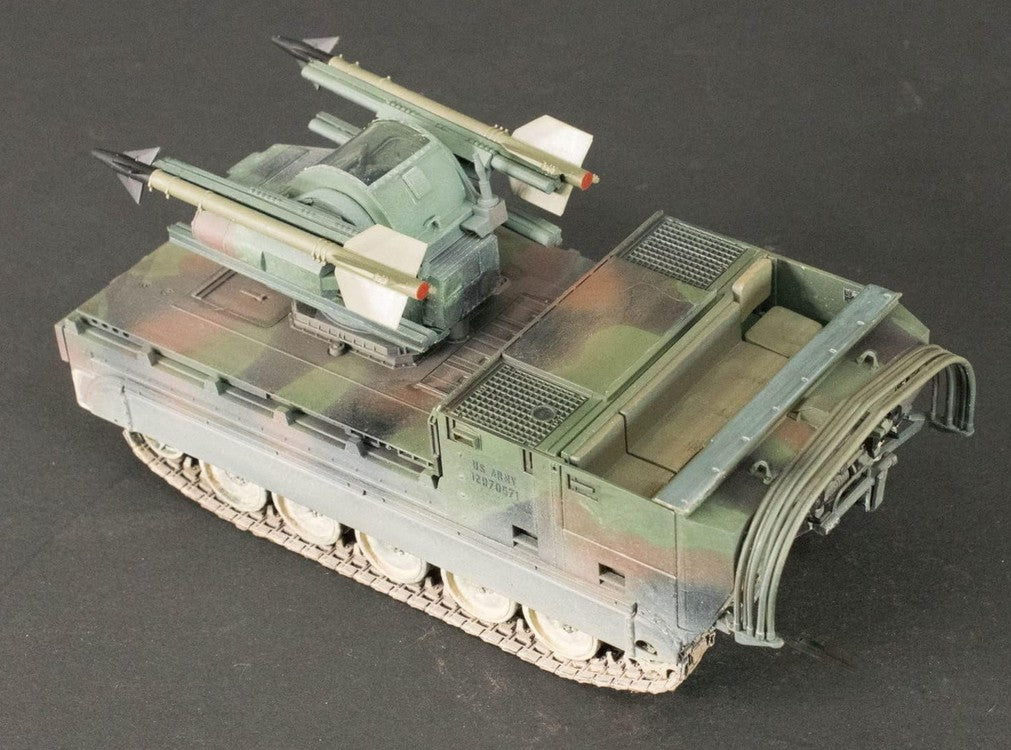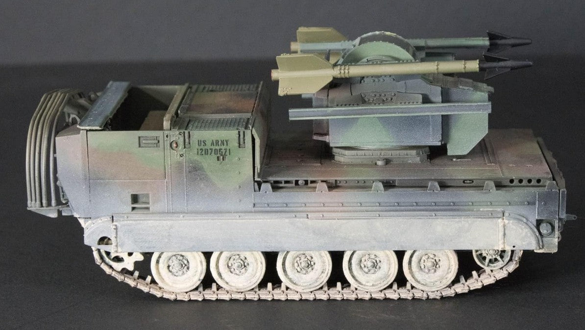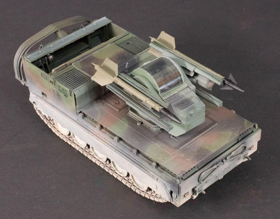 • Modelo de vehículo blindado norteamericano M730A1 Chaparral en su versión de defensa aérea,  en escala 1/35.