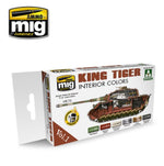 - Este set incluye los colores necesarios y exactos para pintar los interiores de un King Tiger. Desde el color Cremeweiss del interior de la cámara de combate hasta el color verde de las transmisiones y cajas de cambio pasando por el color de los motores.
