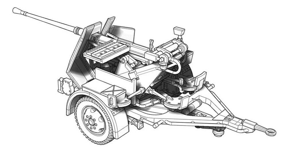 - Modelo del cañón antiaéro alemán Flak36 de 37mm con carrito de transporte, en escala 1/72.