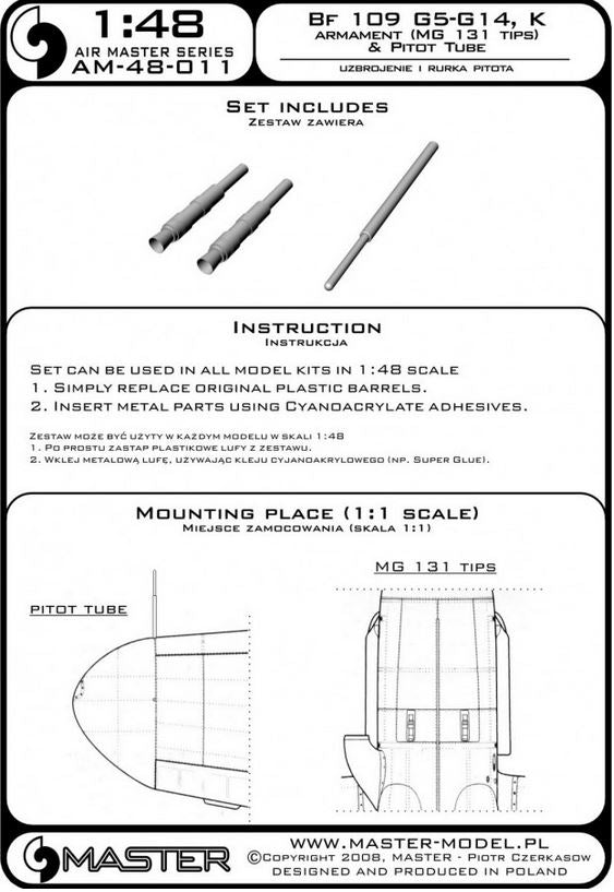 MASTER (1/48) Bf 109 G5 - G14, K armament set (MG 131 tips) & Pitot Tube