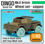 - Conjunto de resina de neumáticos deformados por el peso, para el vehículo blindado ligero Dingo del fabricante TAMIYA (ref. TAM32581) en escala 1/48.