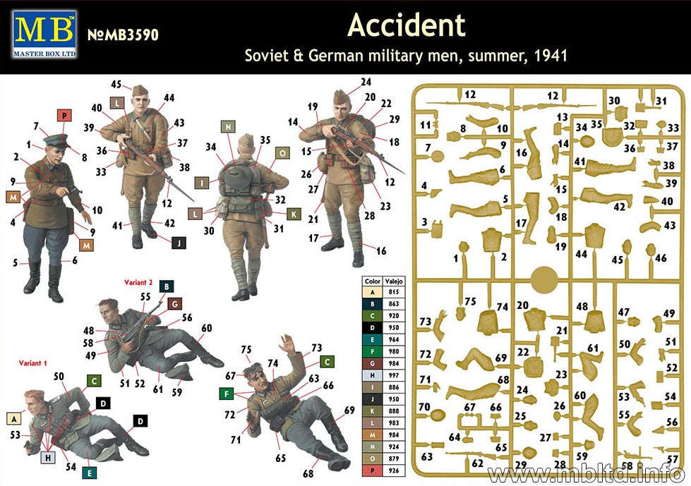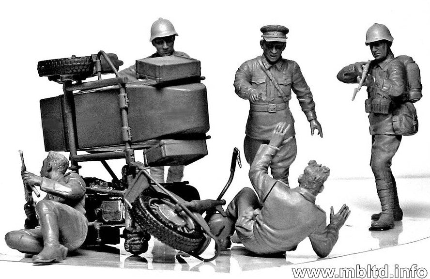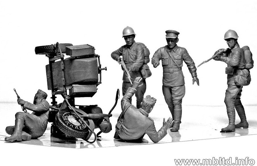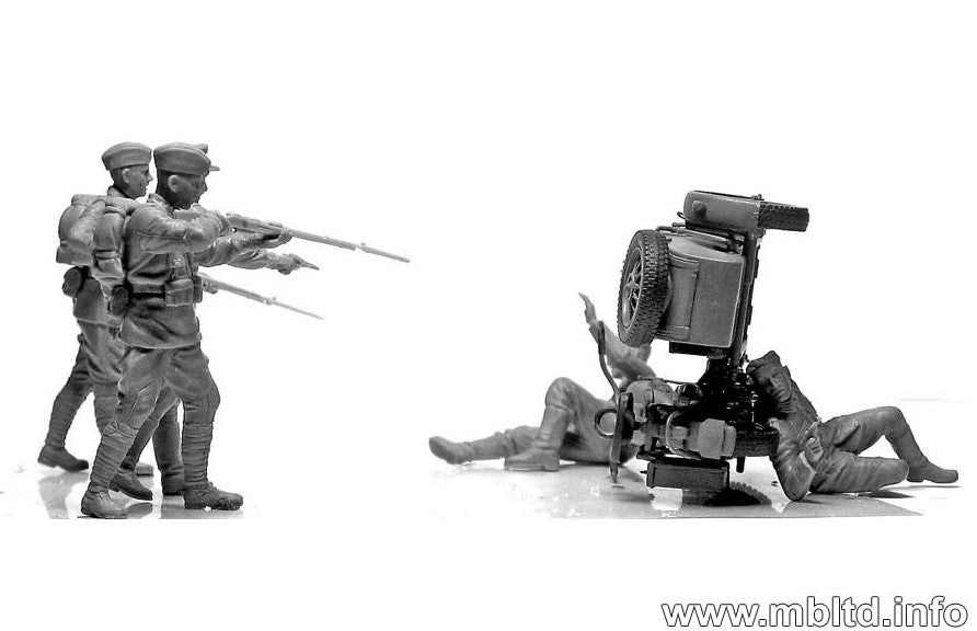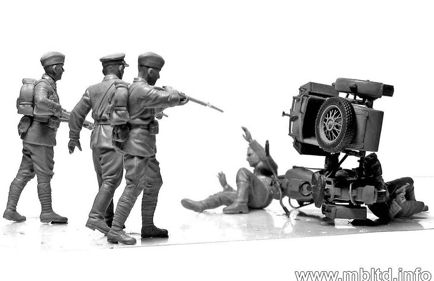 - Conjunto de figuras de infantería rusa atacando a un par de soldados alemanes durante la Operación Barbarroja en verano de 1941, en escala 1/35.