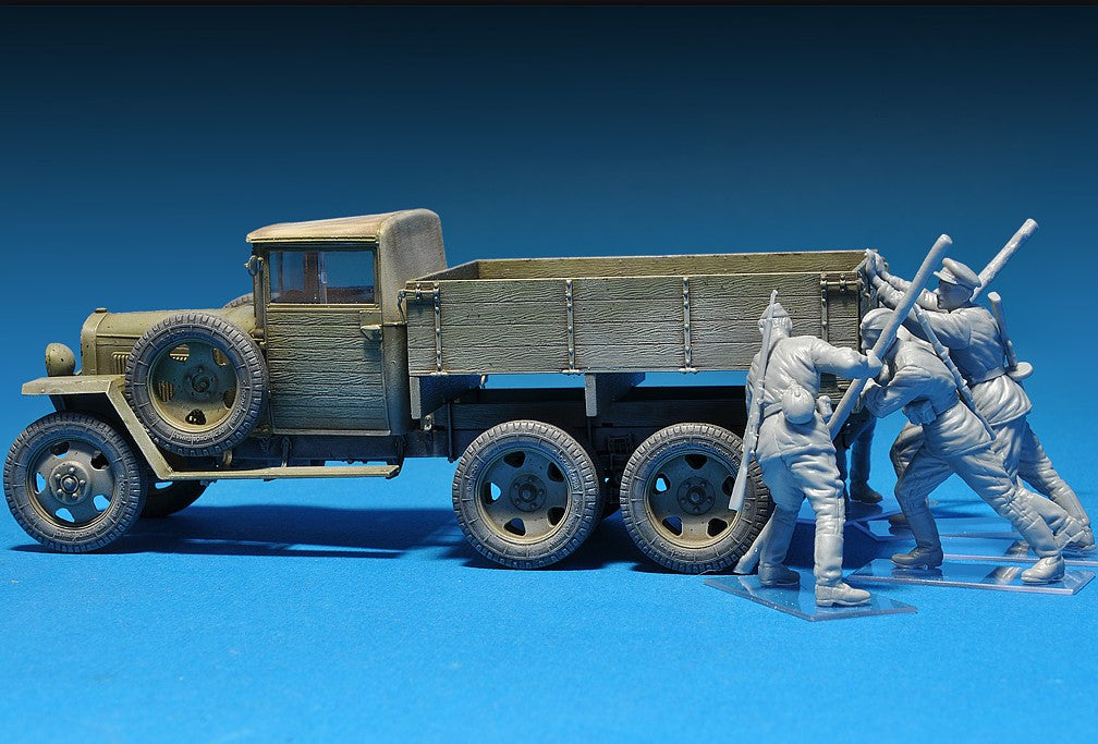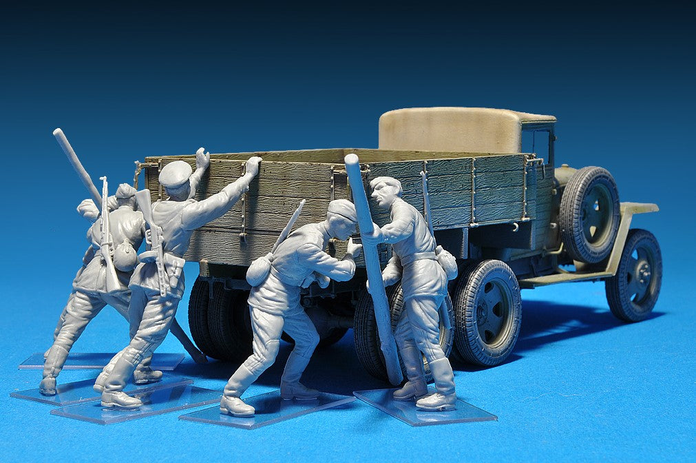 - Conjunto de soldados soviéticos empujando para sacar a un vehículo del barro, en escala 1/35.