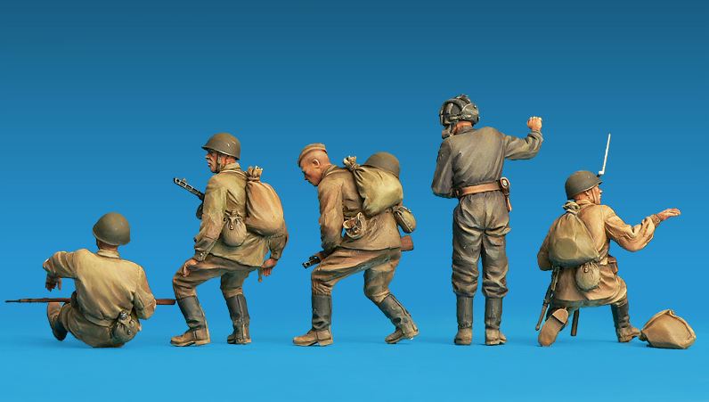 - Conjunto de figuras jefe de carro y soldados soviéticos montados en el vehículo, en escala 1/35.