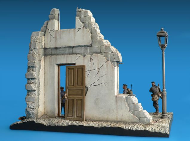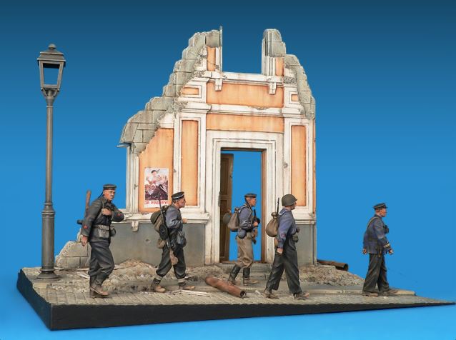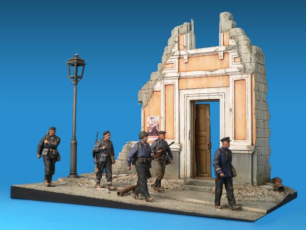 - Conjunto de edifcio en ruinas y sección de calle, junto con figuras de infantería de marina soviética en escala 1/35.