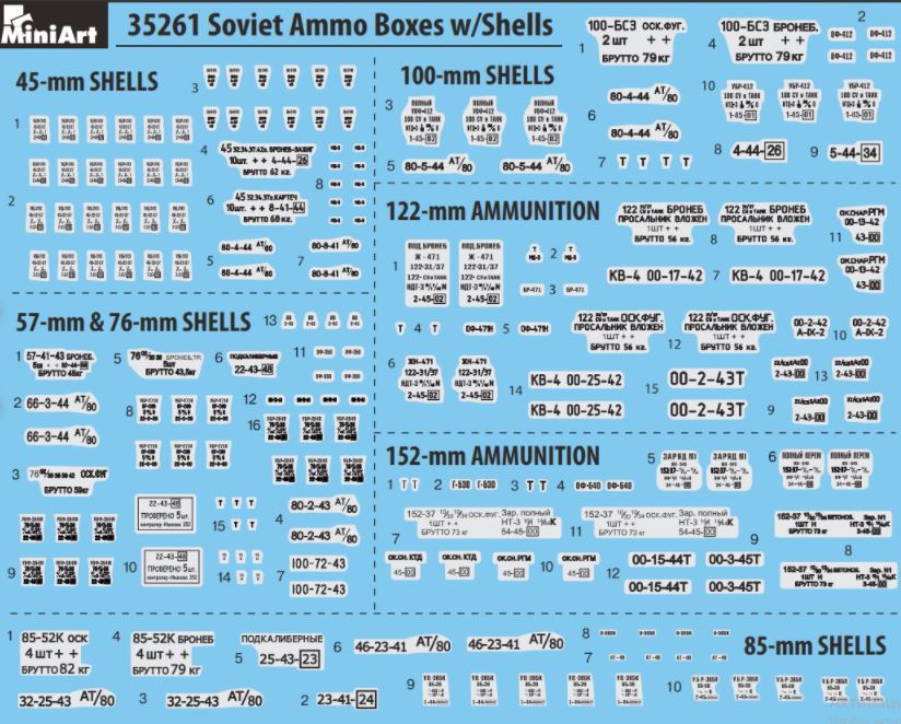 - Conjunto de munción de tanque de distintos calibres del ejército soviético en escala 1/35.