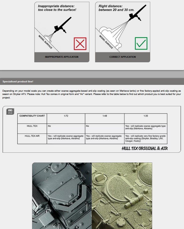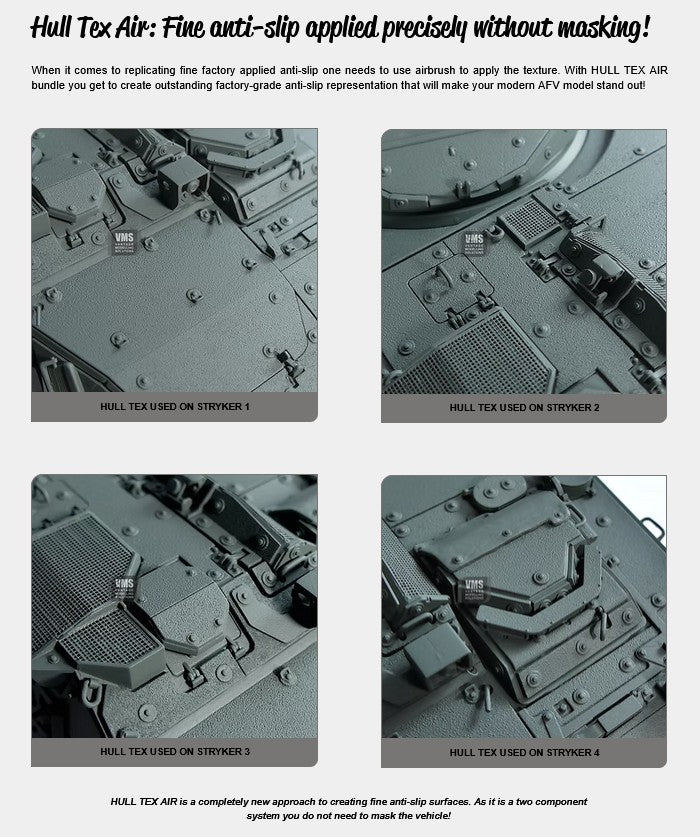 - Una solución única para replicar los recubrimientos antideslizantes aplicados en fábrica, como los que se ven en vehículos como el M2 Bradley, la familia de vehículos Stryker, LAV, AVGP Cougar, AVGP Husky, Leopard, Boxer y otros.