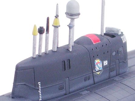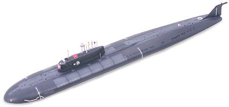 - Modelo de submarino nuclear ruso Kursk, de la clase Oscar II, hundido el 12 de abril de 2000 con toda su tripulación, en escala 1/700.