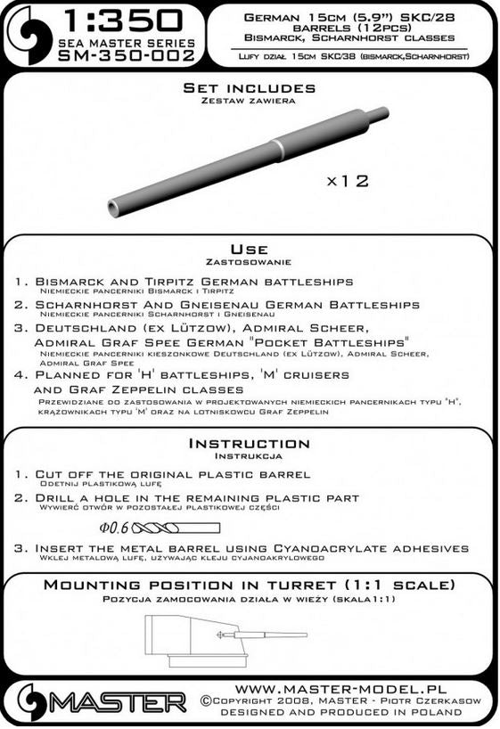 - Set de 12 tubos de cañones navales alemanes de 15cm (5,9 pulgadas) modelo SKC/28, en escala 1/350.