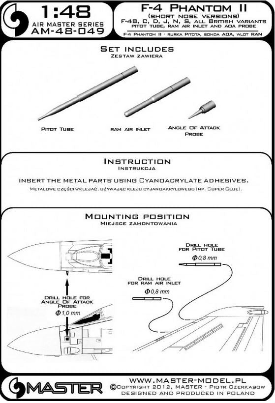 - Tubo pilot, sonda de ángulo de ataque y tubo de toma de aire para aviones de origen norteaméricano F-4 Phantom II con nariz corta en sus versiones B, C, D, J, N, S y todas las variantes británicas, en escala 1/48.