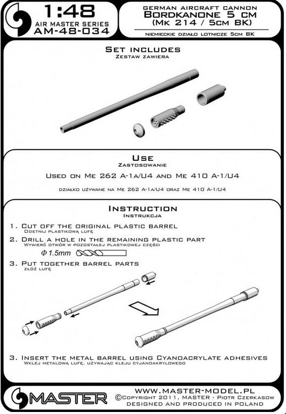 - Cañón Bordkanone de 50mm Mk 214 utilizado por los aviones alemanes Me 262 A1a/U4 y Me 410 A1/U4, en escala 1/48.