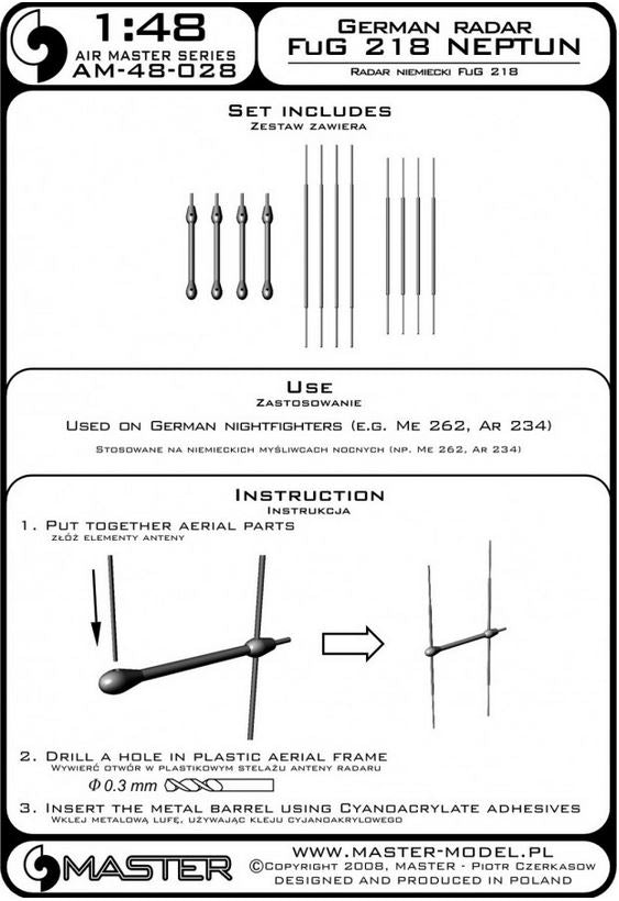 - Juego de antenas de radar FuG 218 Neptun utilizado por cazas nocturnos alemanes como el Me 262, Me110, Ar 234 entre otros, en escala 1/48.