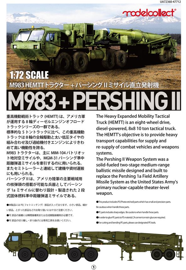 - Modelo de vehículo blindado de transporte pesado norteamericano M983 HEMTT con lanzador de misiles Pershing II, en escala 1/72.