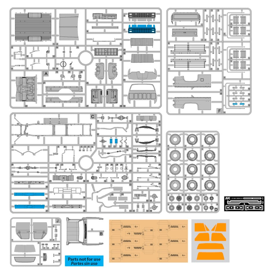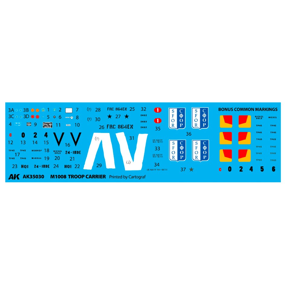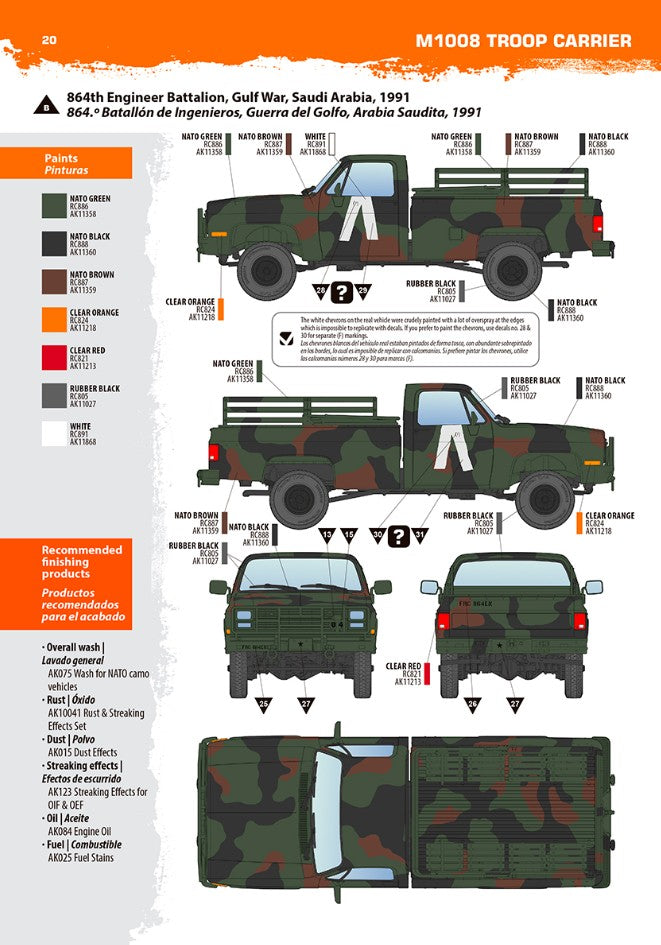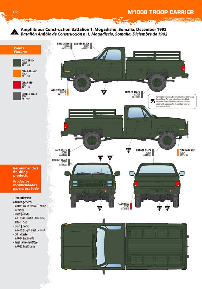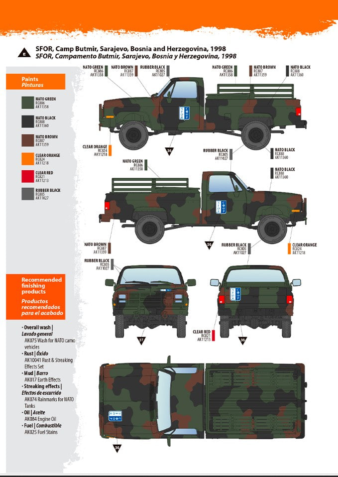 Letonia o Líbano. - Esta referencia representa la versión clásica del camión de carga del vehículo equipada con asientos para tropas en la caja, los cuales pueden montarse en posición plegada o desplegada. La compuerta trasera también puede fijarse en posición cerrada o abierta, o mantenerse móvil. La hoja de calcas contiene marcas para dos vehículos del Ejército de EE. UU., dos de la Marina de EE. UU. y uno de la SFOR, cada uno con un color general o esquema de camuflaje diferente.