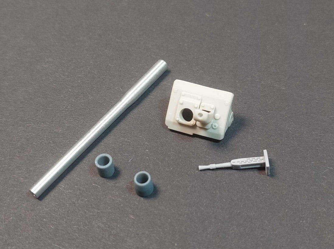 - Incluye ametralladora, bocacha y mantelete de cañón (en su versión inicial) hechos en resina.