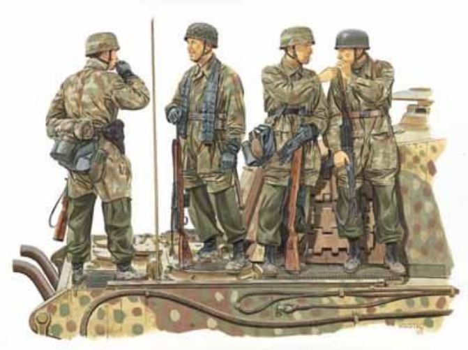 - Conjunto de paracaidistas alemanes de la 3ª División de Paracaídistas durante la Batalla de las Ardenas durante el invierno del 44 al 45, en escala 1/35.