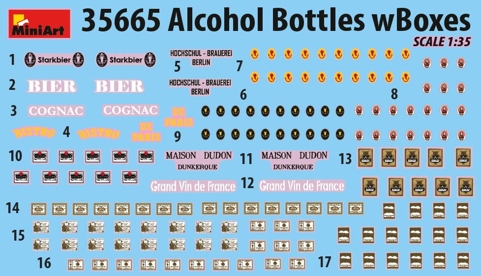 - Conjunto de botellas de cristal de vino, champagne y otros alcoholes, en escala 1/35.