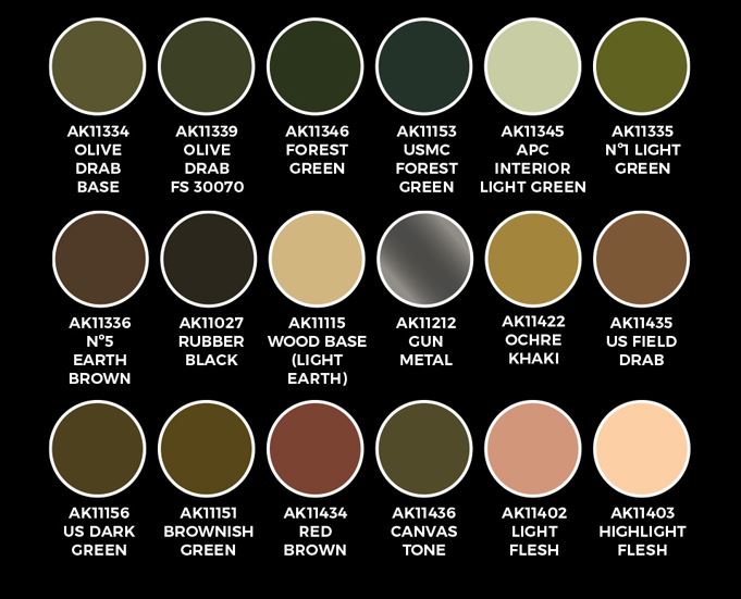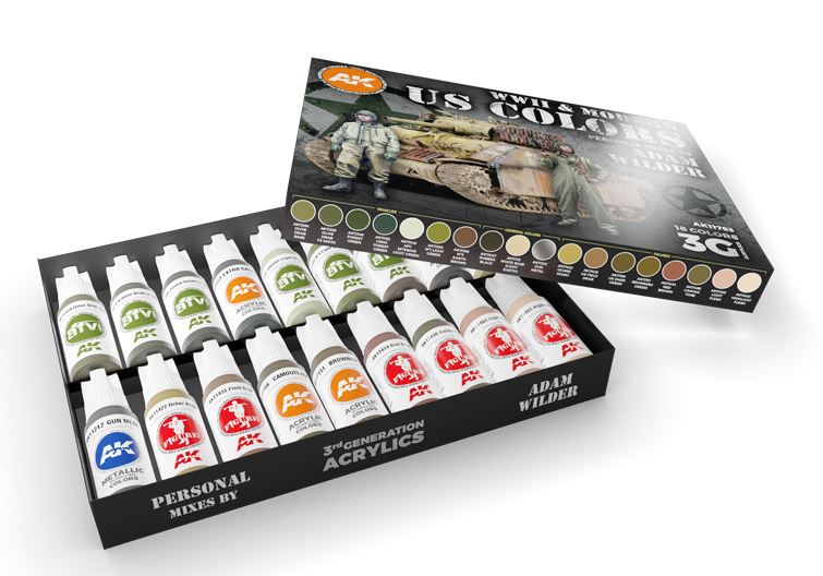 - Este set personal de AK Interactive incluye una selección de 18 colores considerados por Adam esenciales para pintar una amplia variedad de vehículos militares modernos y de la Segunda Guerra Mundial utilizando la mejor pintura acrílica del mercado. Su selección incluye colores para pintar las capas base, las herramientas y los uniformes de los soldados.