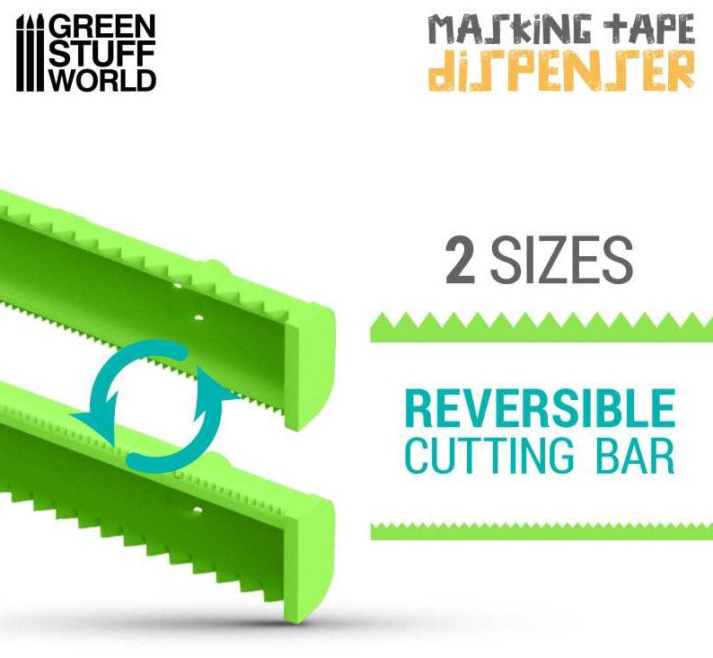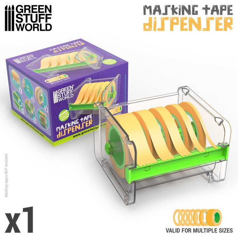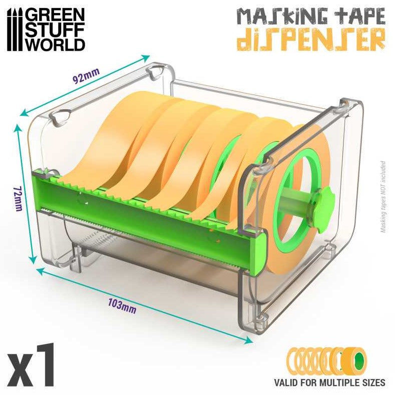- Diseñado para su uso con cintas de enmascarar de modelismo de varios anchos y que gracias a su estructura transparente permite controlar fácilmente la cinta restante sin necesidad de abrir el dispensador. Su soporte interior giratorio permite girar y desenrollar la cinta con suavidad, evitando enredos y garantizando un fácil acceso a la longitud deseada. También incluye una barra dentada reversible de doble filo que permite a los usuarios cortar la cinta con facilidad.