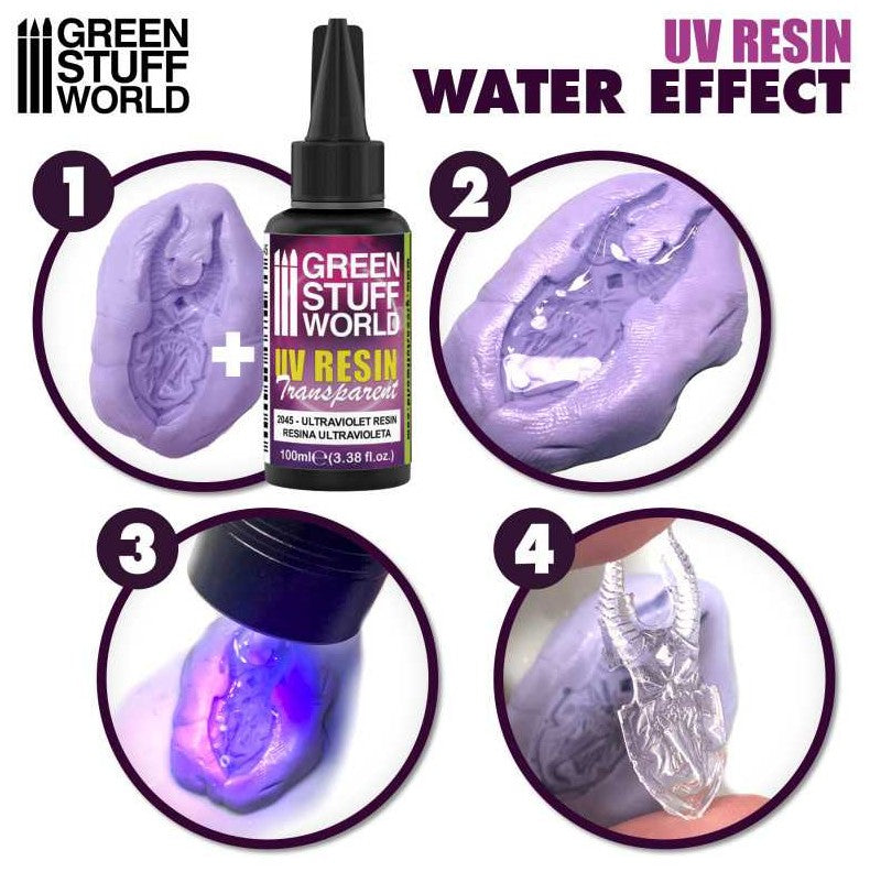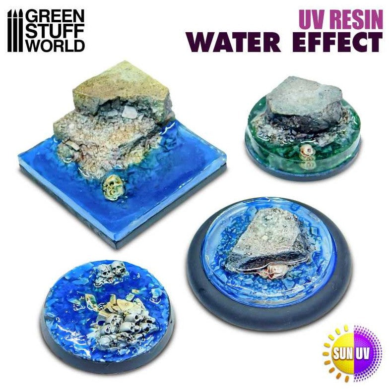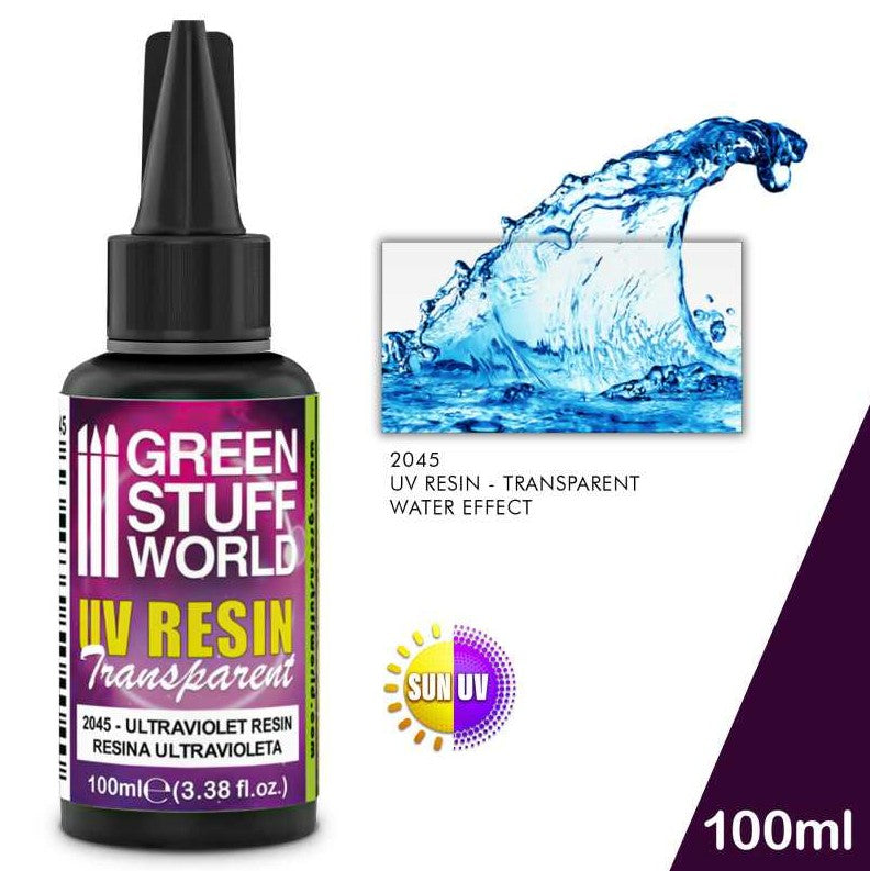 - Una nueva alternativa para artistas y modeladores que deseen crear efectos de agua realistas con esta Resina Ultravioleta. Este innovador gel tiene una transparencia cristalina y puede ser presionado directamente desde el frasco en tu diorama o base de miniatura para crear hermosas réplicas del mar, ríos, lagos, charcas o charcos de agua.