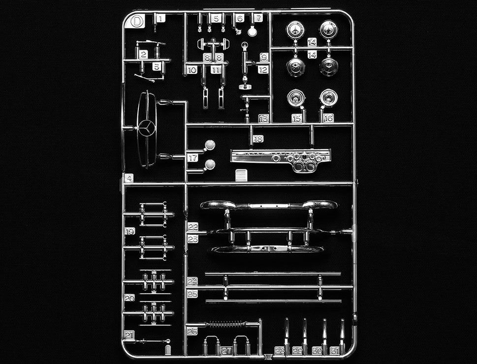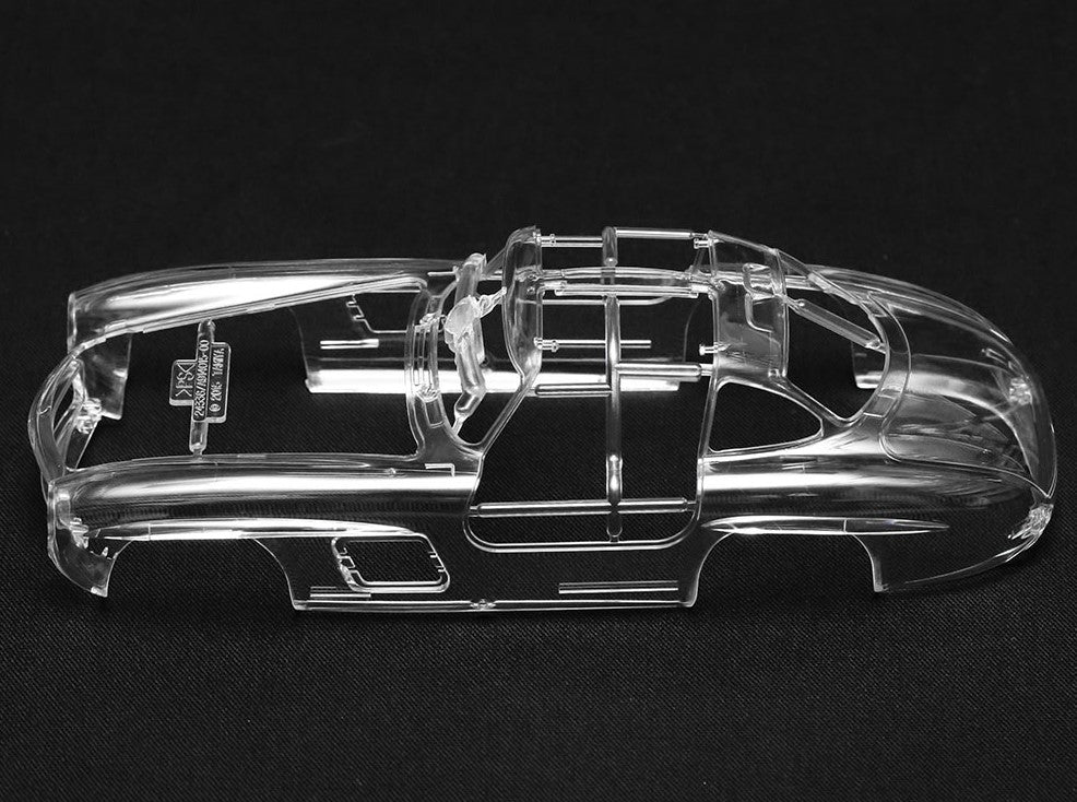 - Maqueta sin montar ni pintar del clásico Mercedes Benz 300SL con carrocería transparente, en escala 1/24.