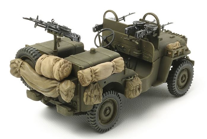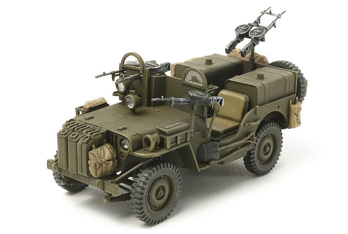 - Modelo de vehículo ligero y observación británico Jeep, utilizado por los comandos del SAS, en escala 1/35.