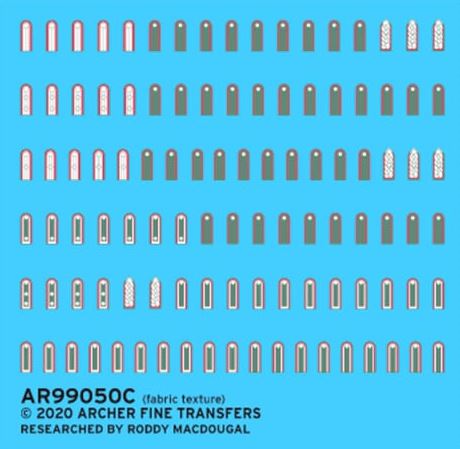 - Juego de calcas de hombreras de uniformes para tropas de artillería alemanas de finales de la guerra, en escala 1/35.