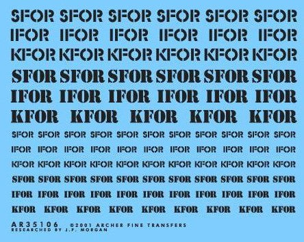 - Hoja de calcas estilo tradicional de simbología de la OTAN y distintas misiones internacionales, en escala 1/35.