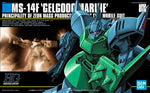 - Un mobile suite variacion de MS-14 Gelgoog, diseñado para Zeon Marine Corps, mejorando su ratio de peso/potencia, movilidad y maniobrabilidad, llegando a rivalizar con el posterior MS-14Jg Gelgoog Jäger. Modelo en escala 1/144.