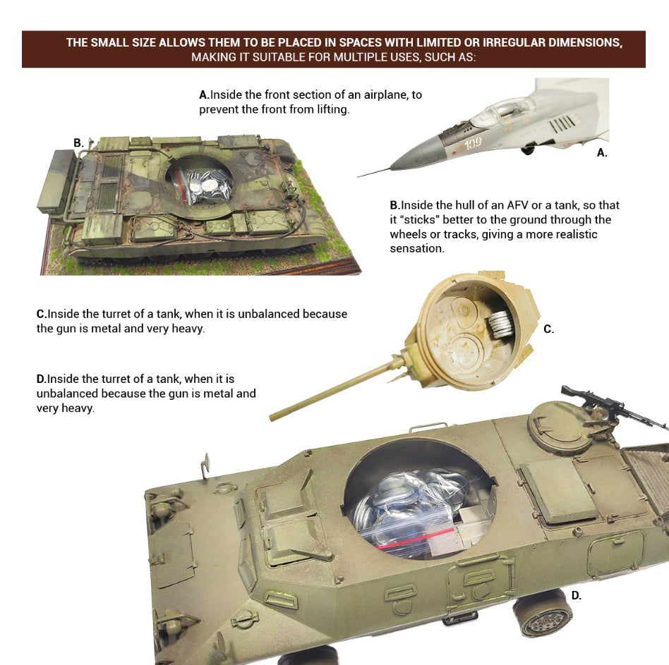 - Peso para incorporar en el interior del modelo o diorama, para equilibrar determinadas posiciones o para dar una mayor sensación de peso al conjunto.