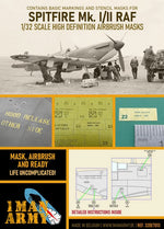 - Hoja de máscara con 22 símbolos y marcas que llevaba el caza Spitfire MkI/II de la RAF en 1941/42, para aviones en escala 1/32.