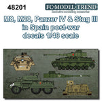 - Juego de calcas para carros de combate de origen alemán Panzer IV y Stug III y norteamericanos M8 y M20 que sirvieron durante años en el Ejército español, en escala 1/48.