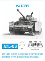 - Set de cadenas de metal para vehículos alemanes Pz-III y Pz-IV en uso desde 1942 a 1945, en escala 1/35.