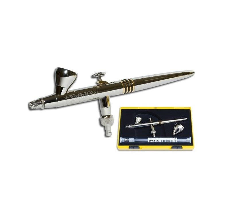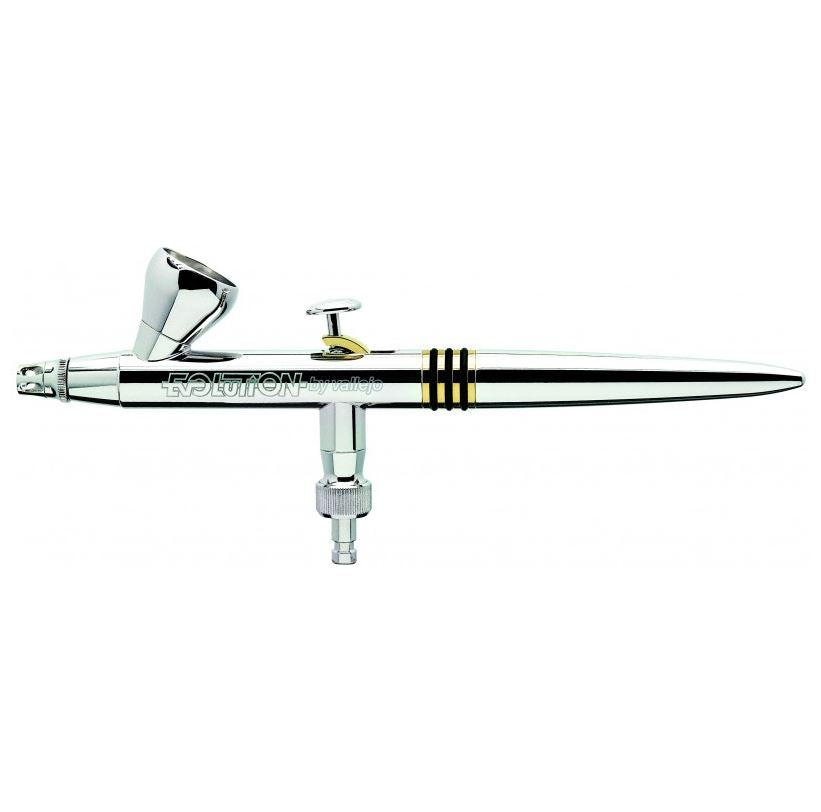 - Aerógrafo de doble acción y alimentación por gravedad, fabricado en Alemania, de reconocido prestigio y precisión asombrosa.
