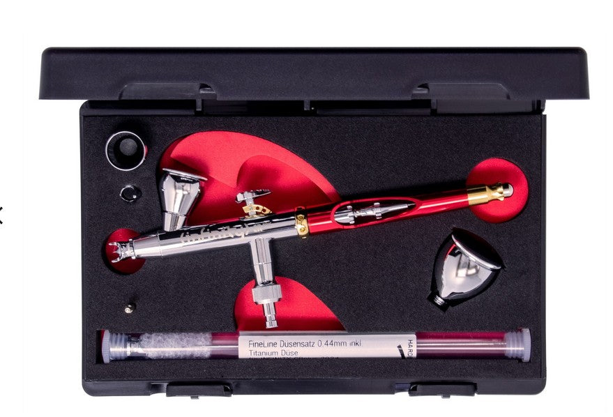 - Aerógrafo de doble acción y alimentación por gravedad para artistas profesionales, fabricado en Alemania, de reconocido prestigio y precisión asombrosa.
