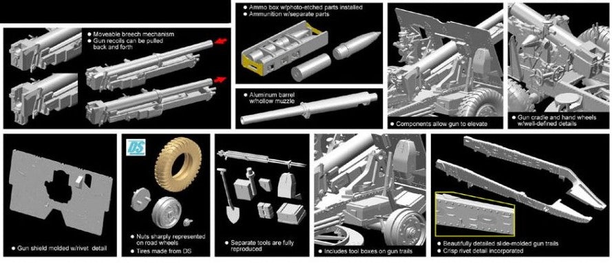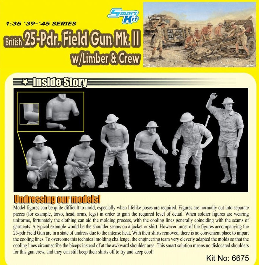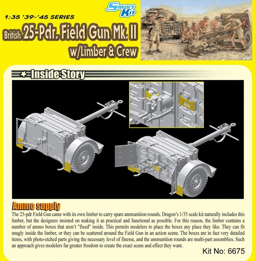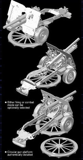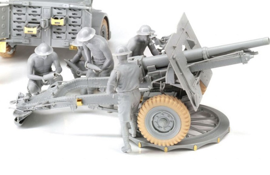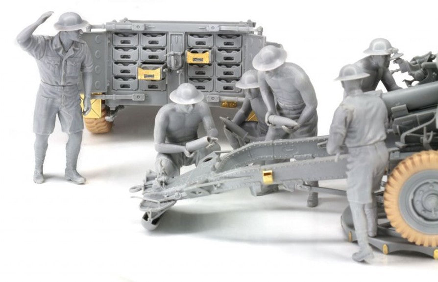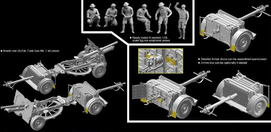 - Modelo de cañón británico de campaña 25pdr Mk.II con carrito de municiones y tripulación, en escala 1/35.