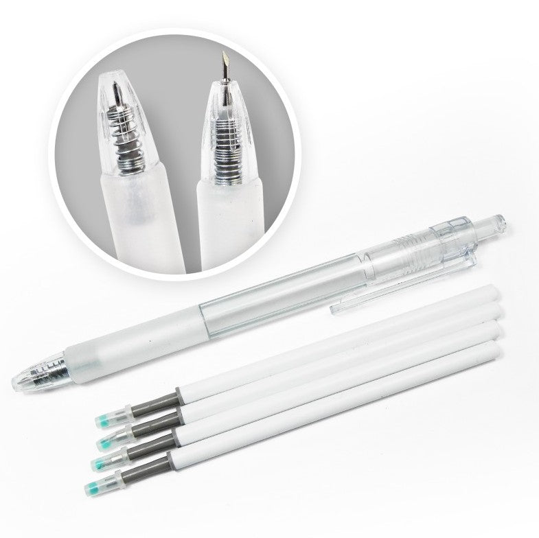 - Incluye: 1 Cuchilla de Precisión en Forma de Bolígrafo + 4 Cuchillas de Recambio con protectores de goma.
