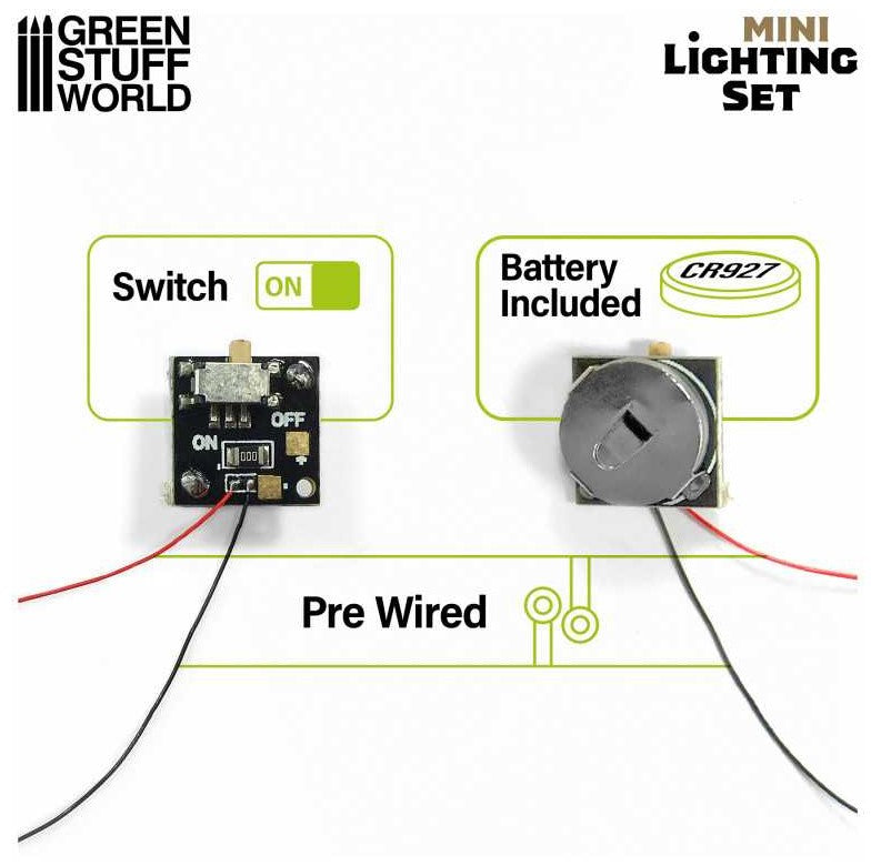 - Mini set de iluminación preensamblado con interruptor y cableado que le permitirá iluminar y apagar sus miniaturas y dioramas sin necesidad de usar ningún tipo de soldadura.