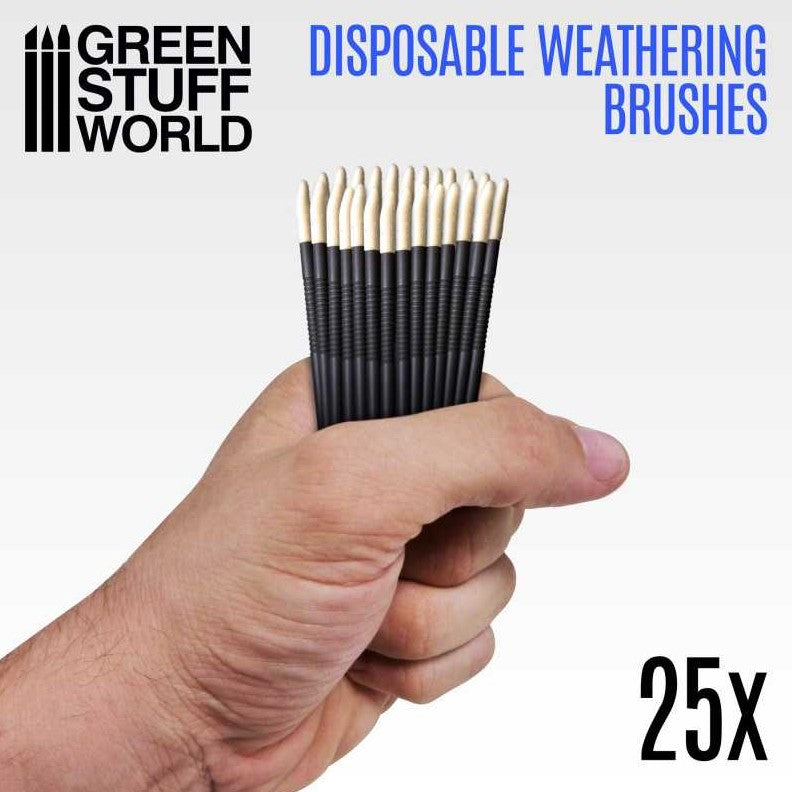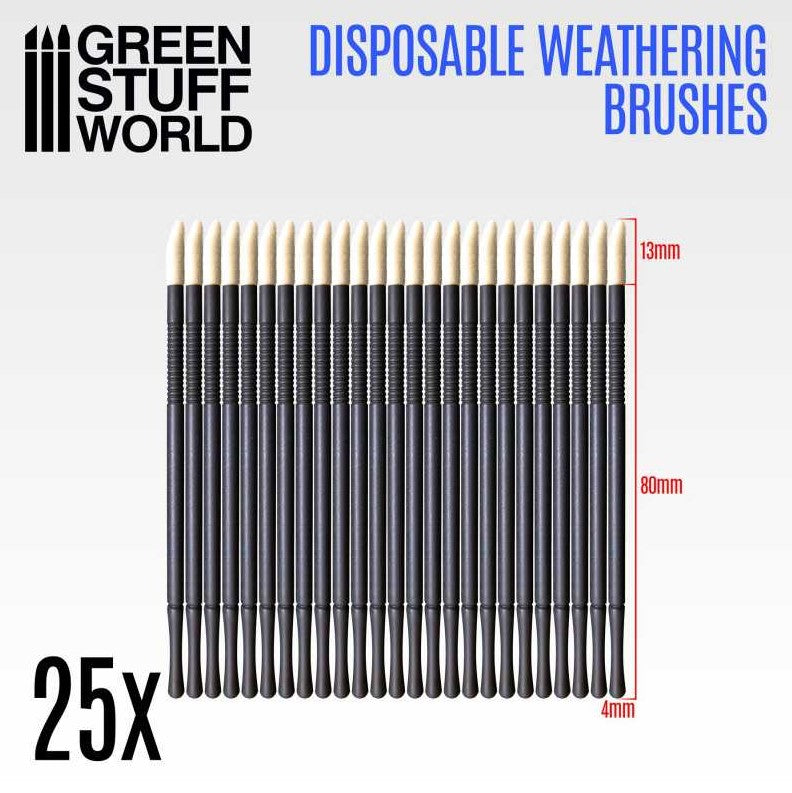 - Paquete de 25 mini pinceles weathering de nylon con mango de plástico duro.