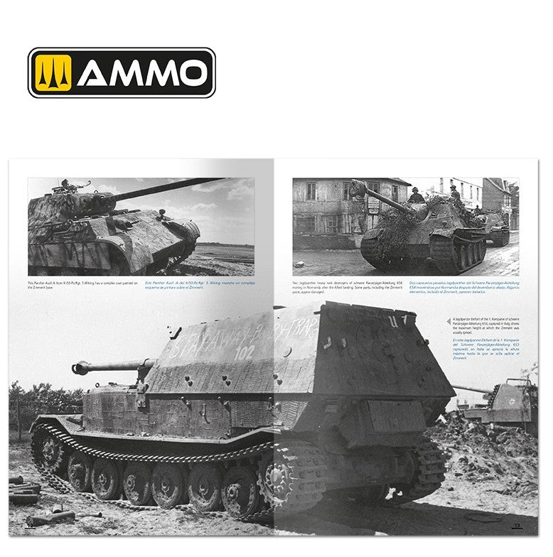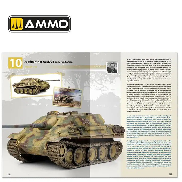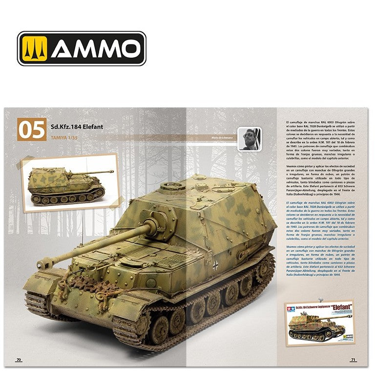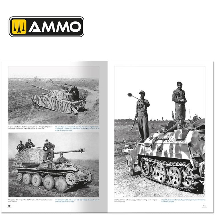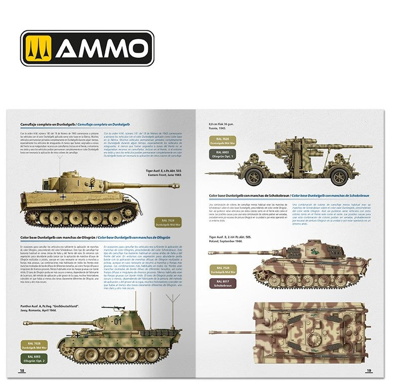 - Además, se incluye una magnífica introducción histórica sobre los camuflajes y distintivos alemanes de mediados de guerra (usados entre febrero de 1943 y septiembre de 1944) obra del historiador y modelista Daniele Guglielmi, acompañada de fotos de la época. Esta guía de camuflajes alemanes de mediados de guerra también está ilustrada con perfiles en color que muestran los diferentes tipos de camuflajes y colores aplicados y el período en el que fueron utilizados.