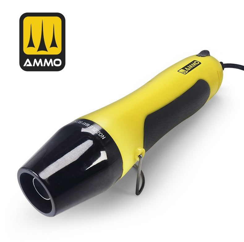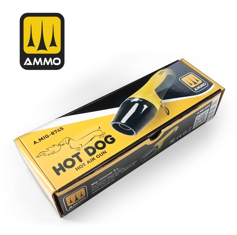 - La Hot Dog de AMMO es una pistola de calor portátil de 350 W, 2 velocidades y temperatura variable (70-100°C y 380°C) para modelismo y manualidades, que proporciona un volumen de aire de 120 L/min y está equipada con un cable de alimentación de 1,5 m (enchufe europeo)