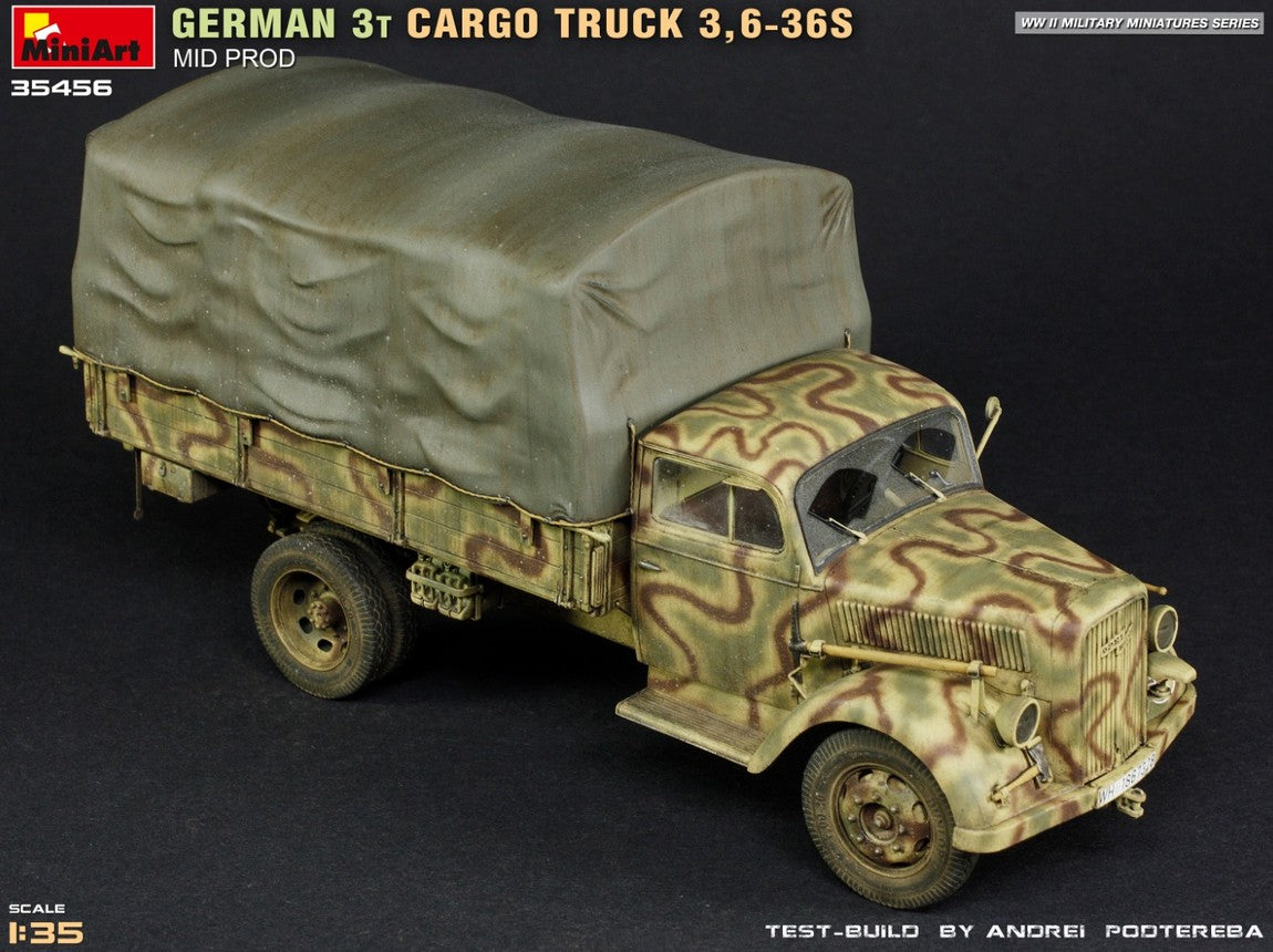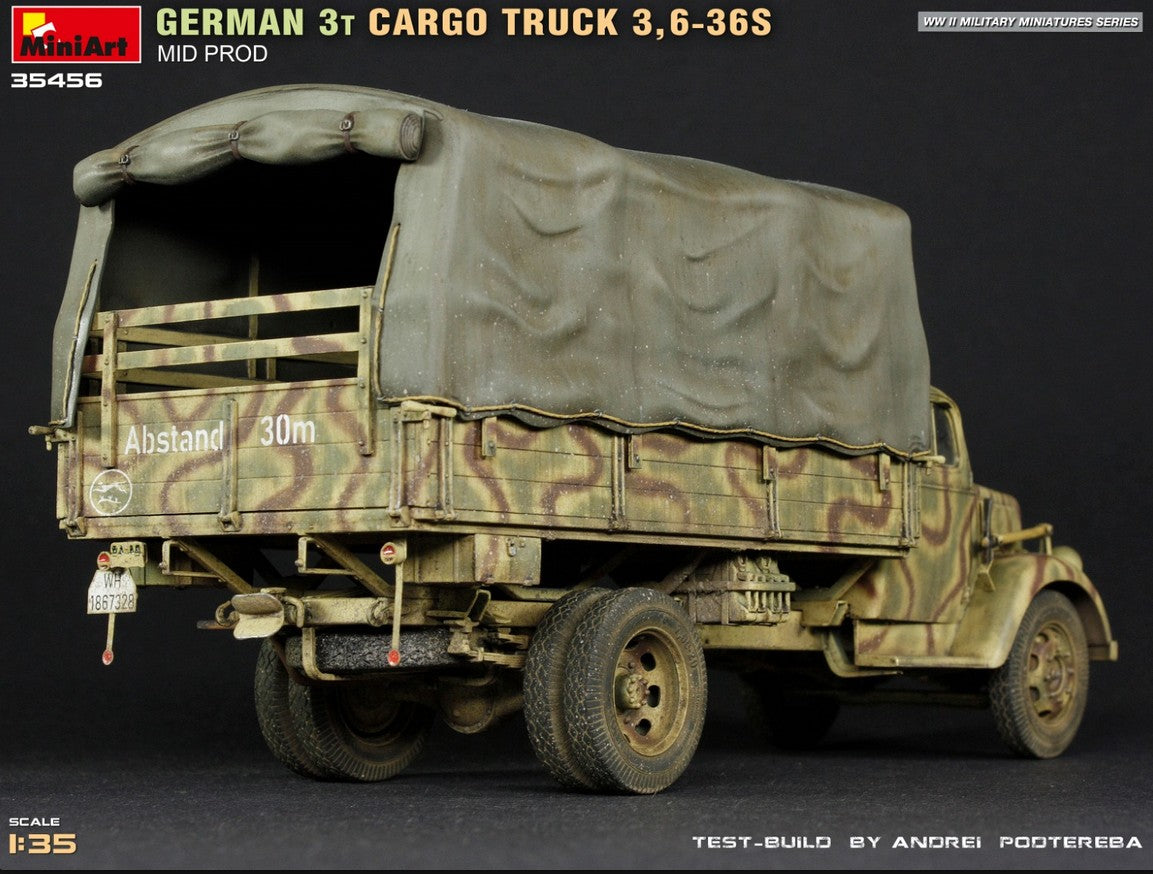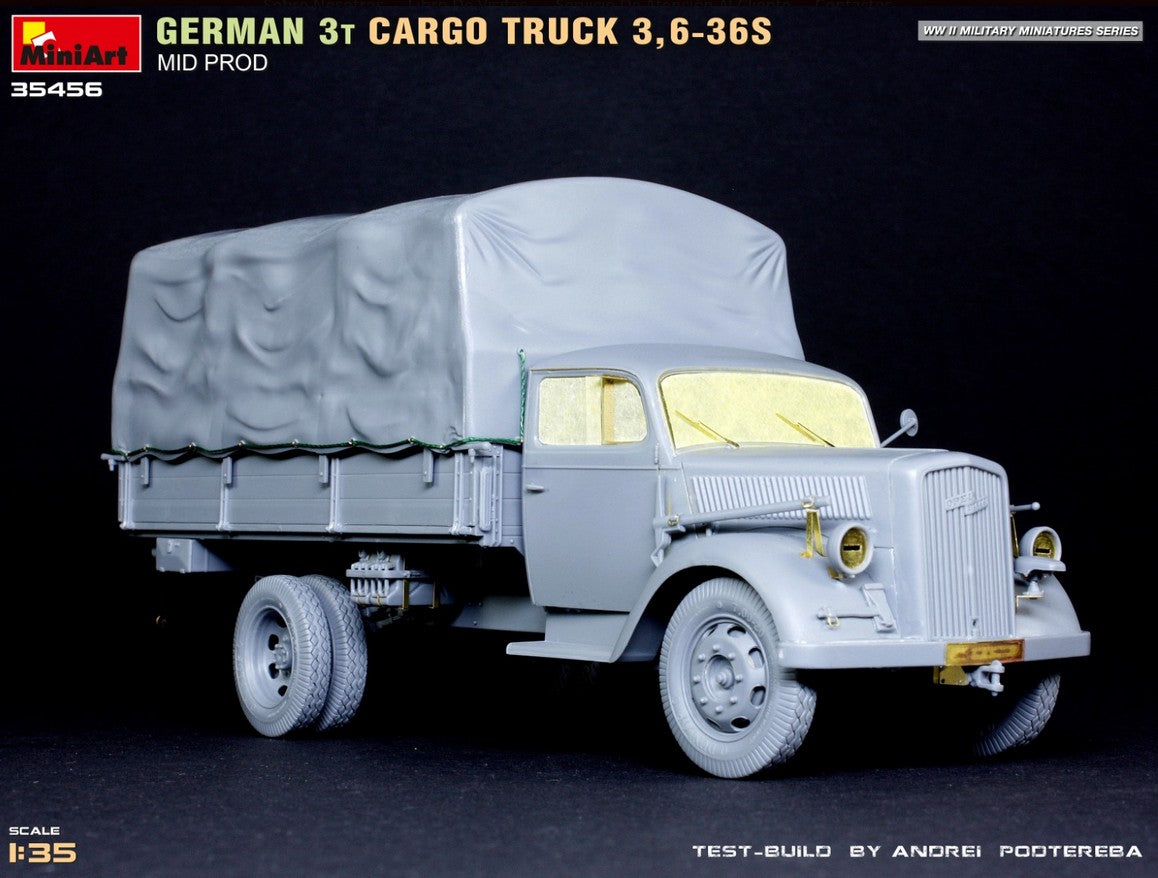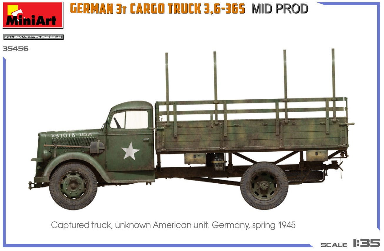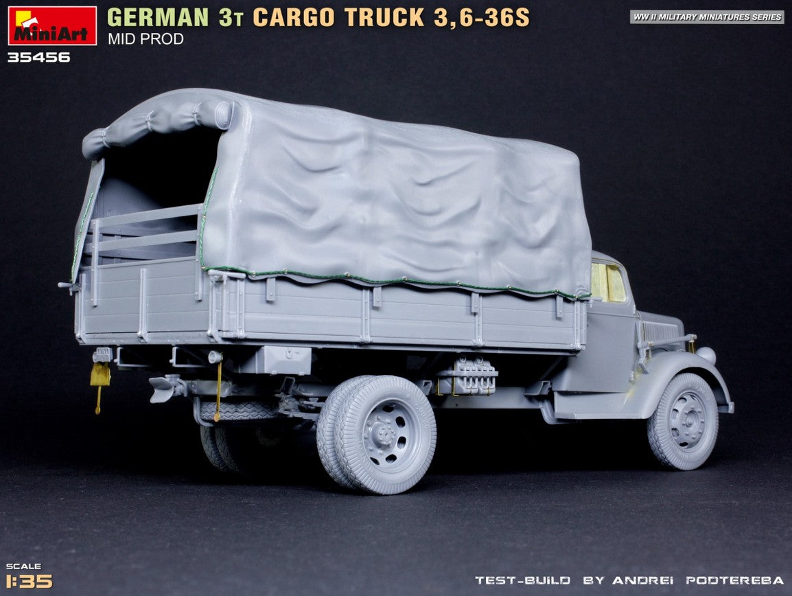 - Modelo de vehículo de carga alemán de 3 toneladas 3,6-36S de producción intermedia y de uso militar, en escala 1/35.