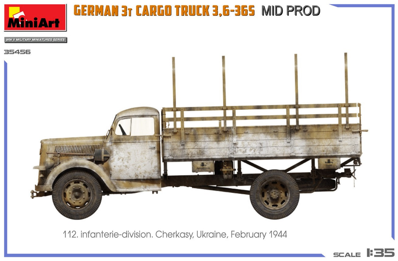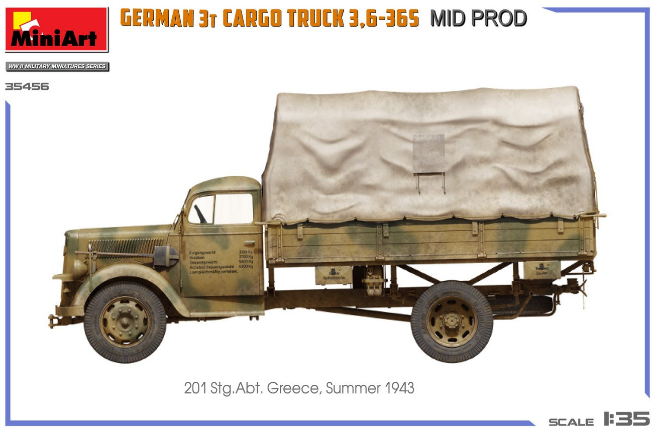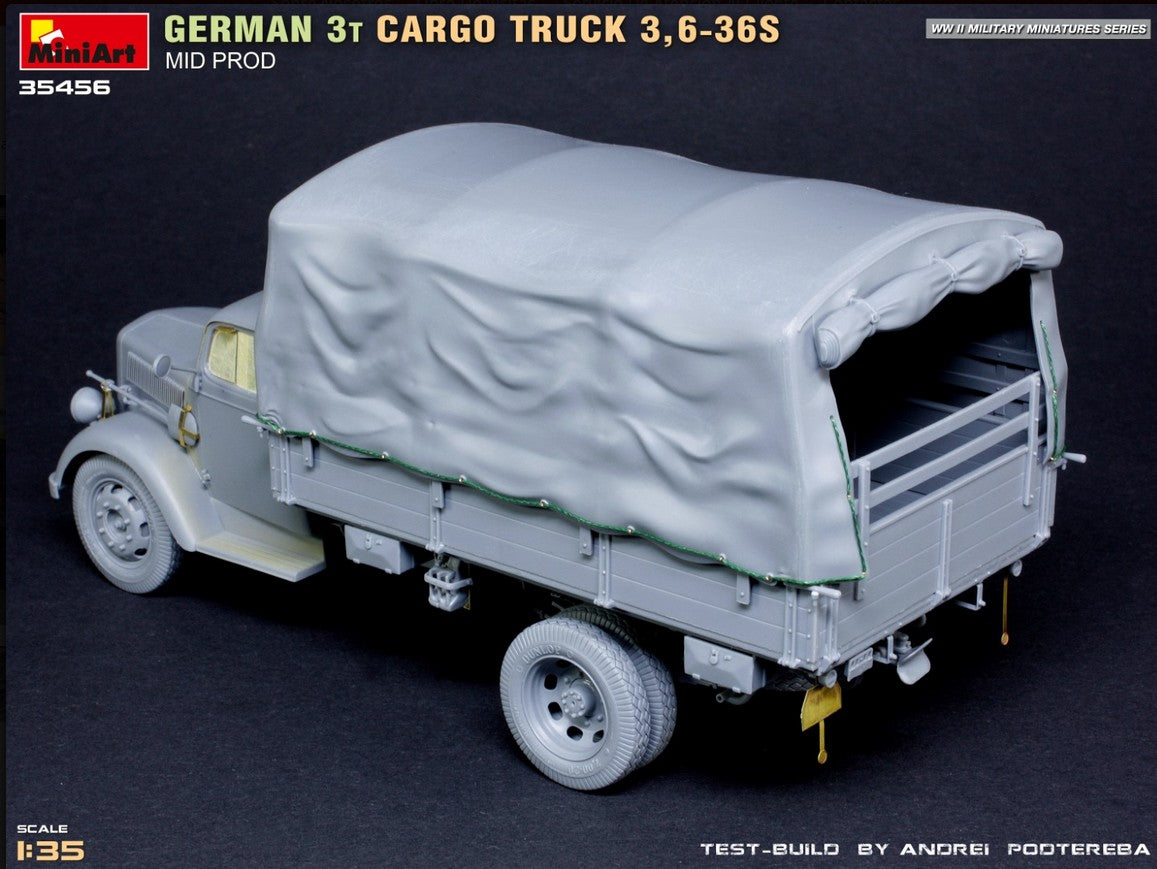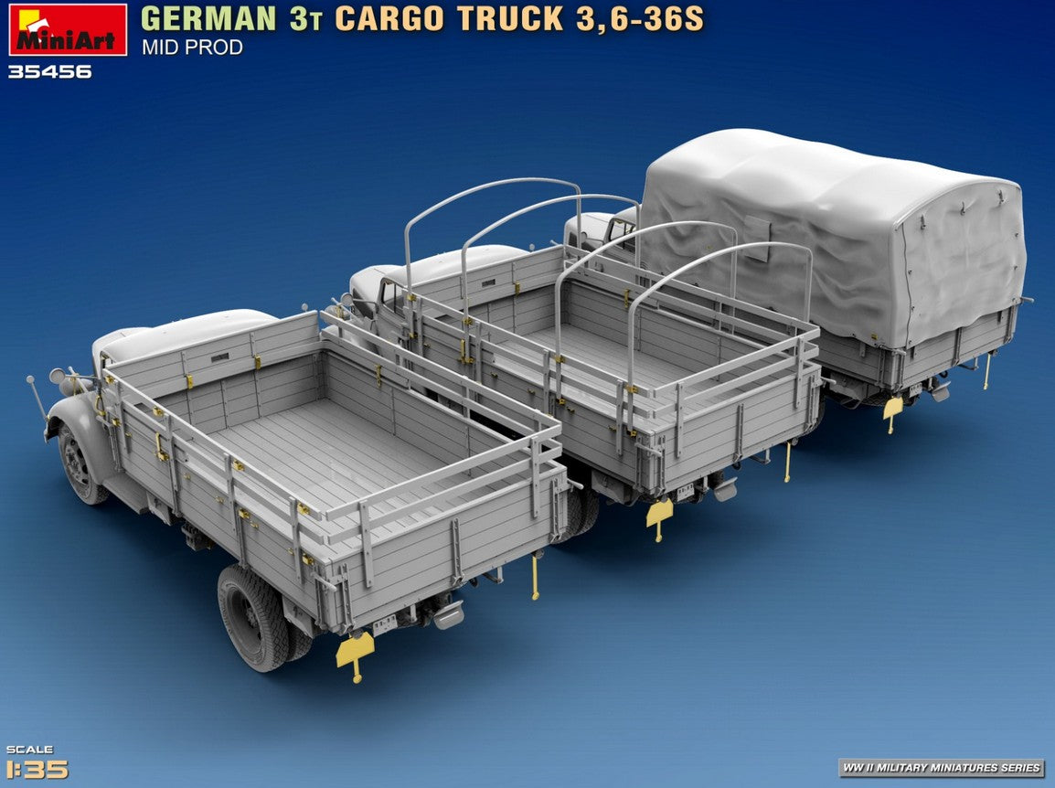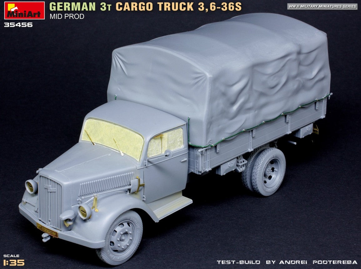- Modelo de vehículo de carga alemán de 3 toneladas 3,6-36S de producción intermedia y de uso militar, en escala 1/35.