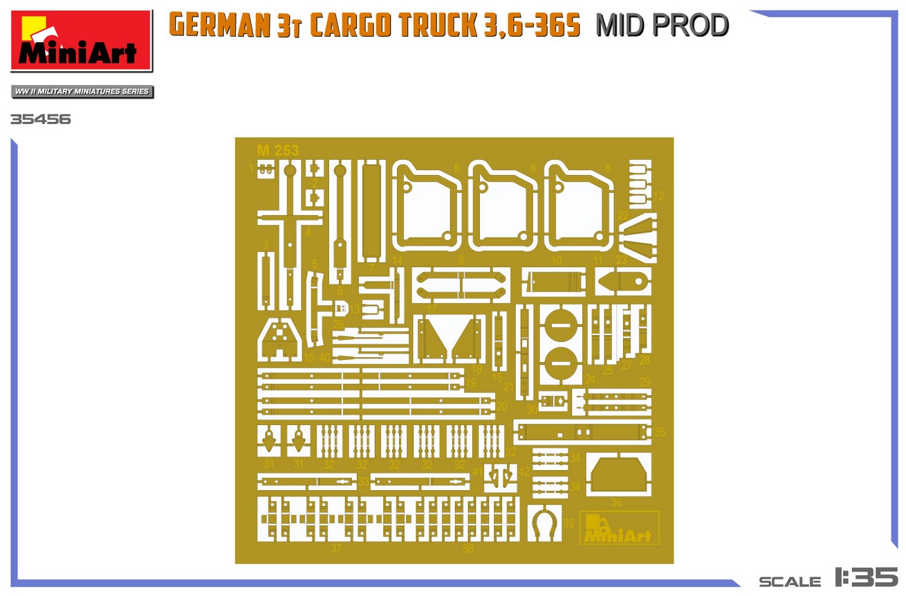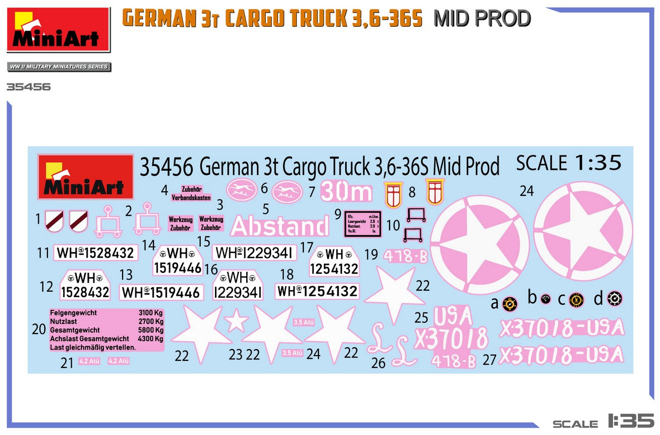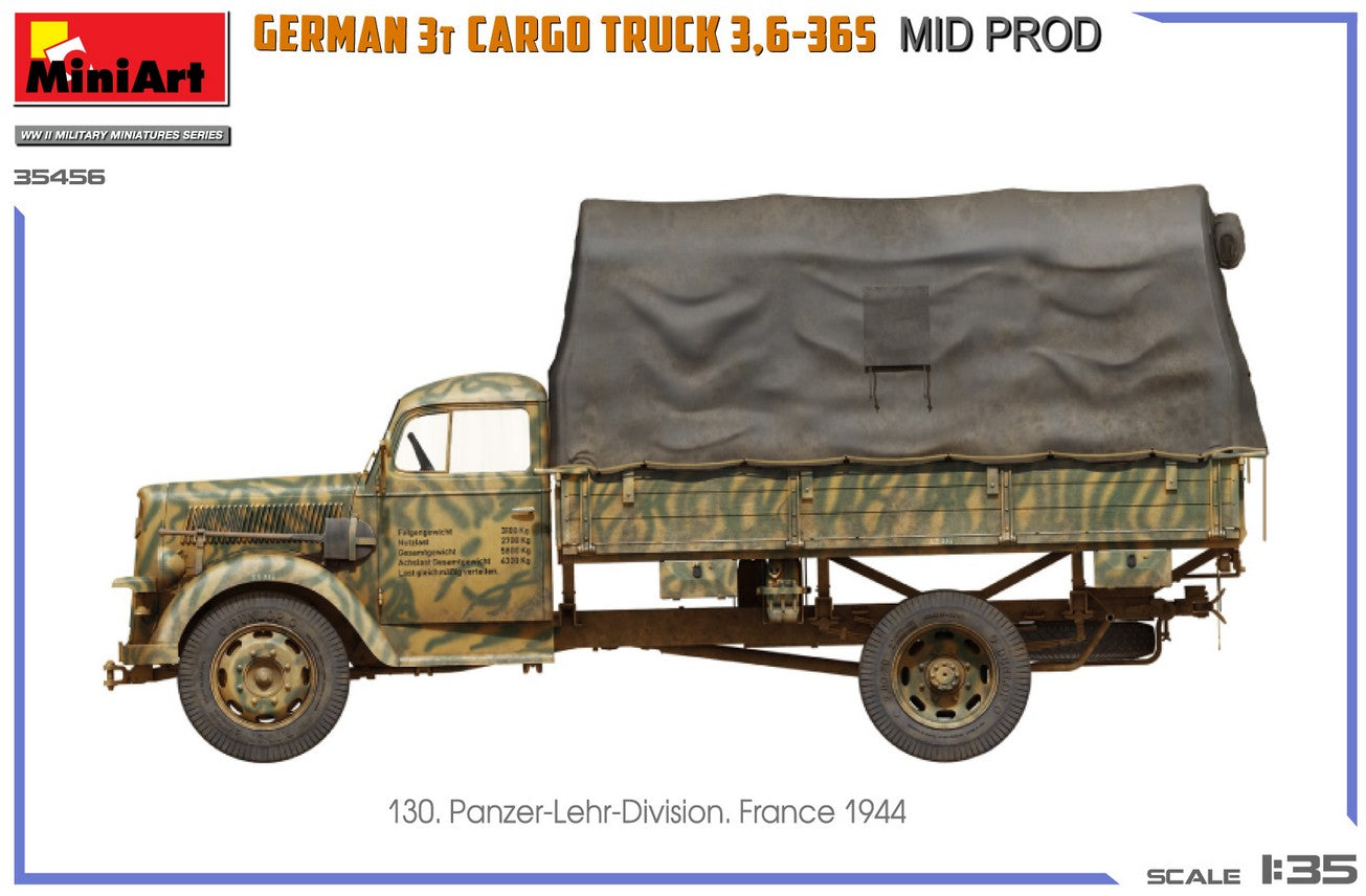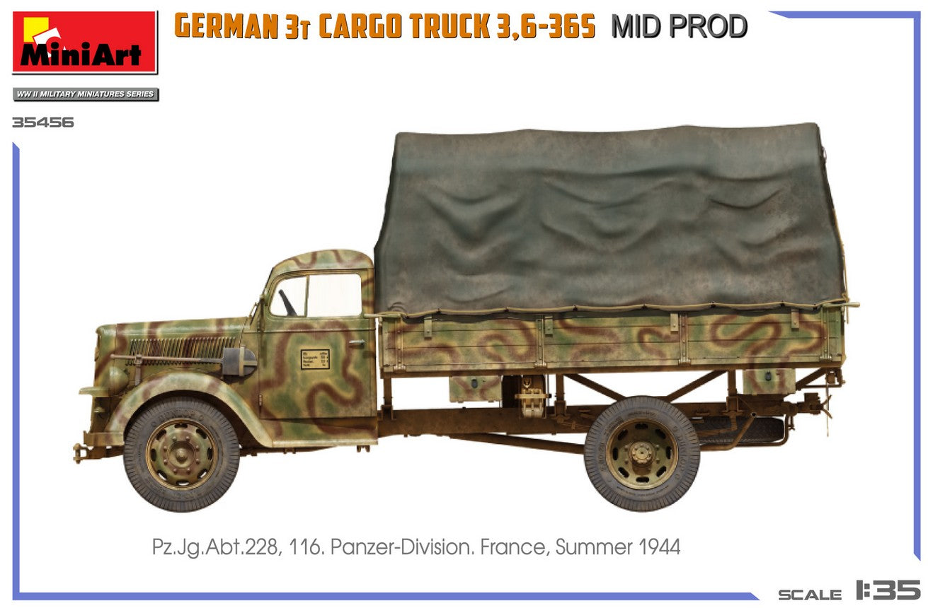 - Modelo de vehículo de carga alemán de 3 toneladas 3,6-36S de producción intermedia y de uso militar, en escala 1/35.