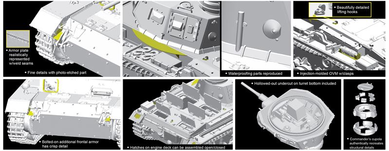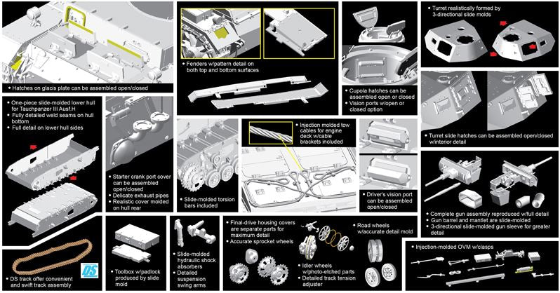 - Modelo de carro de combate alemán Panzer III en su versión H con la modificación que se hicieron a algunos ejemplares para hacerlos sumergibles cuando se estaba planificando la operación Sea Lion de asalto a las Islas Británicas, en escala 1/35.
