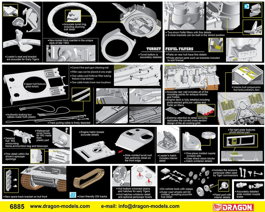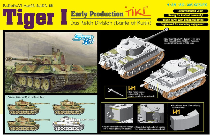 - Modelo de carro de combate pesado Tiger I alemán en versión E y de producción inicial, ambientado en el carro Tiki de la División Das Reich durante la Batalla de Kharkov, en escala 1/35.
