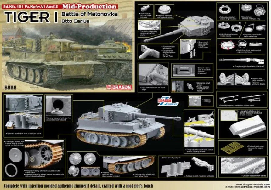 - Modelo de carro de combate alemán Tiger I de producción intermedia, que comandó el mítico Otto Carius durante la Batalla de Malinava en 1944, en escala 1/35.
