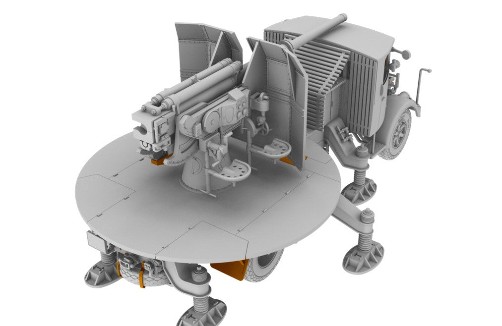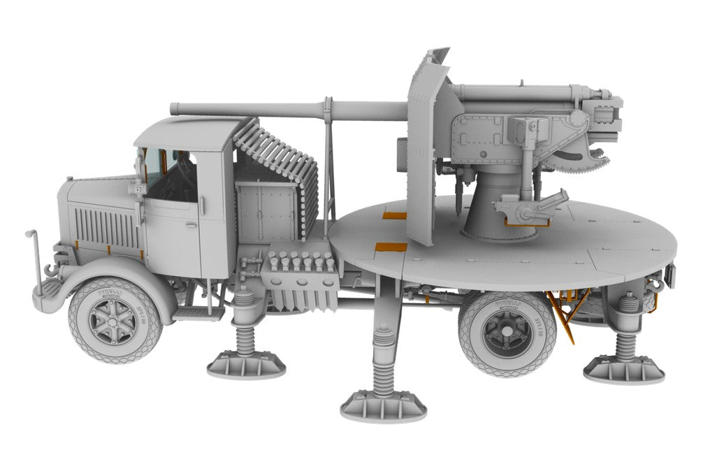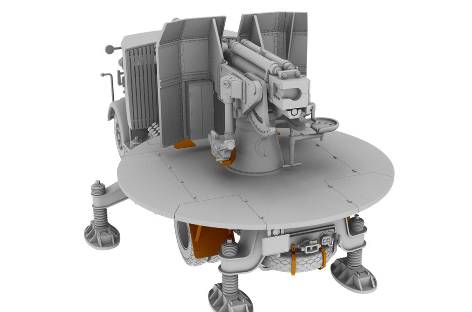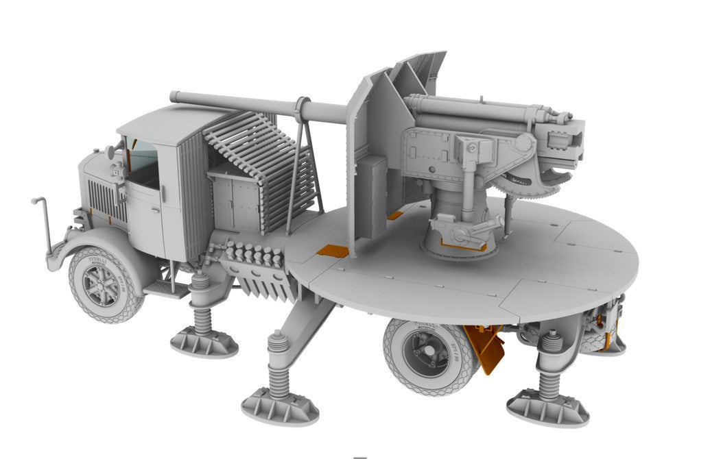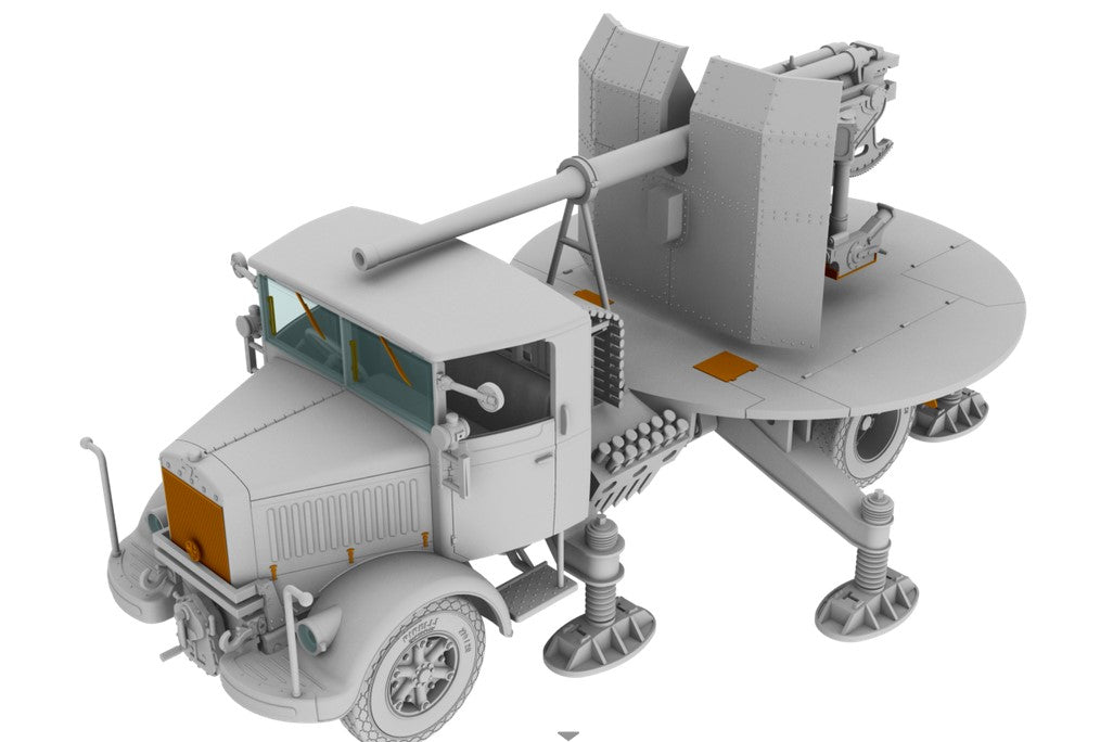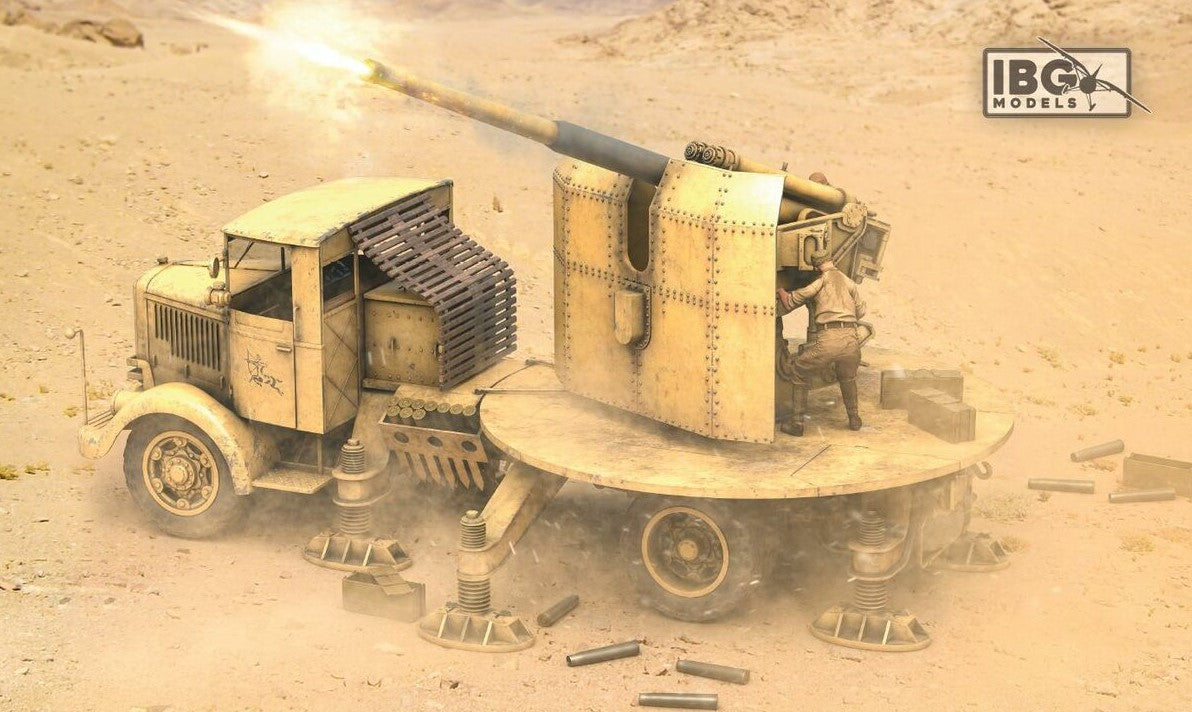 - Modelo de camión de transporte militar italiano 3Ro con cañón antiaéreo 90/53 de 90mm, en escala 1/72.
