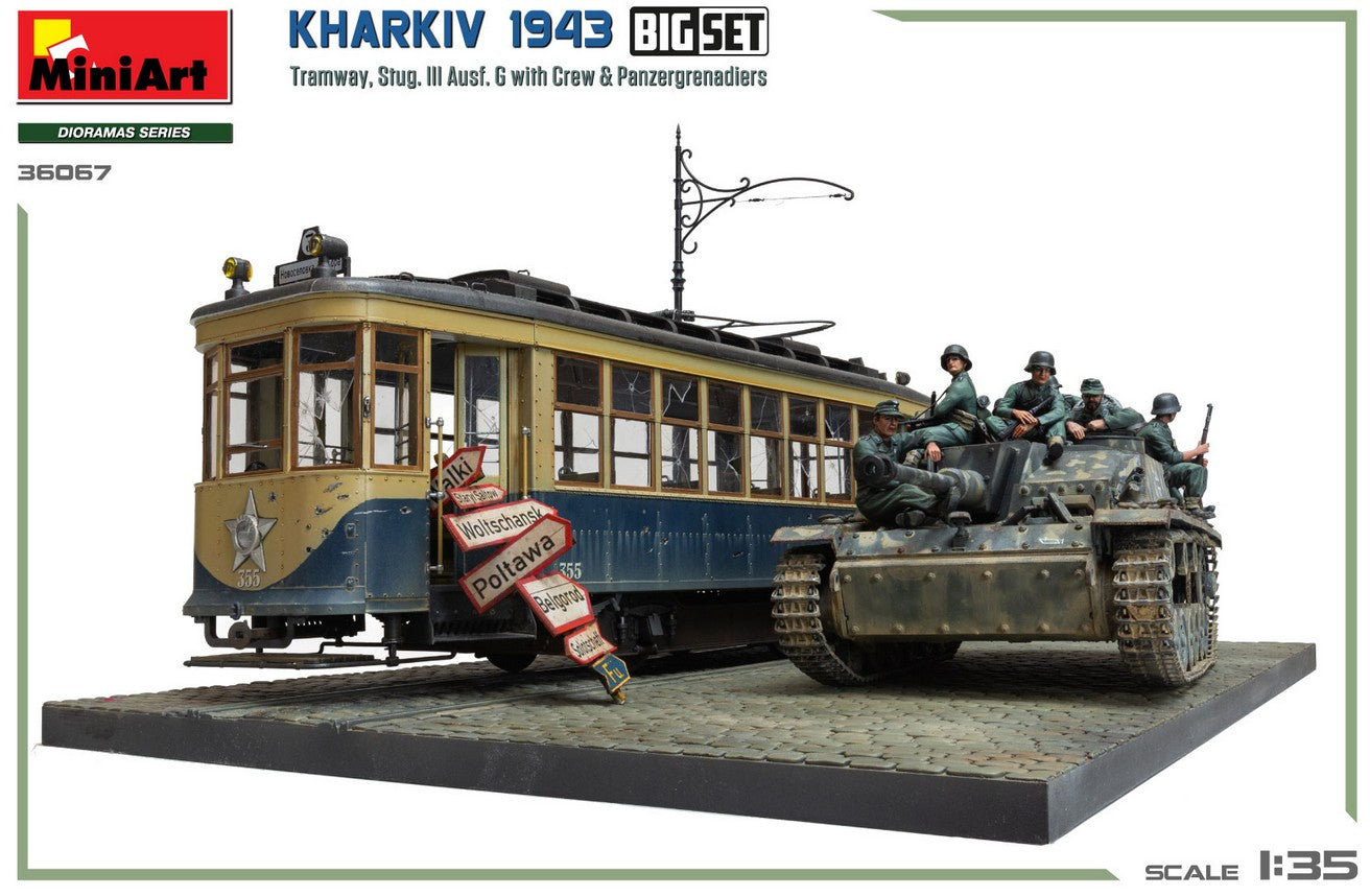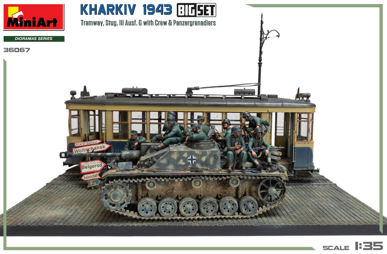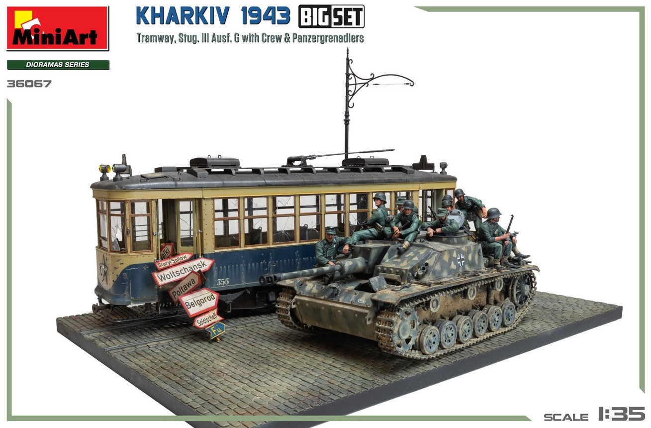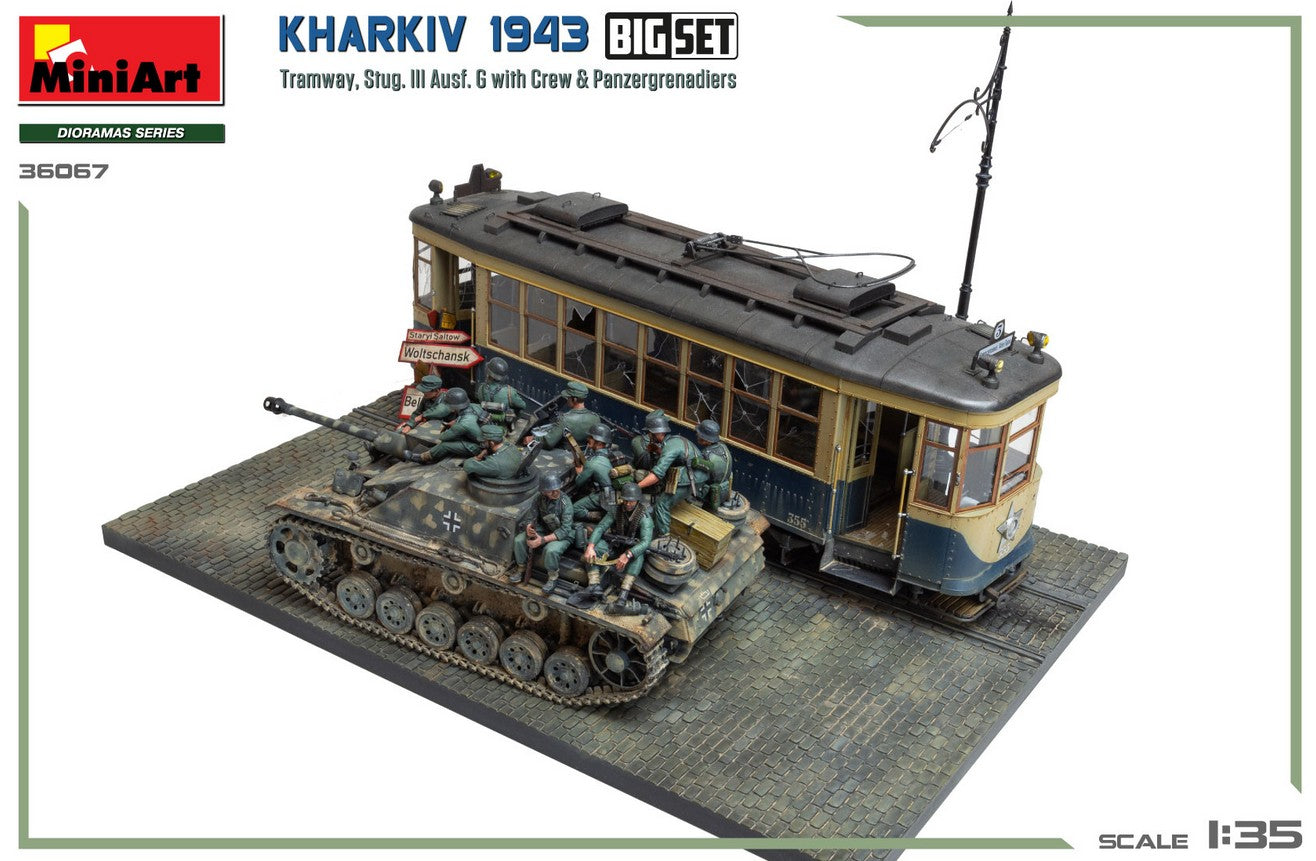 - Conjunto de carro de cañón de asalto alemán Stug III en su versión G y diorama con trabvía soviético durante la Batalla de Kharkov en 1943, en escala 1/35.